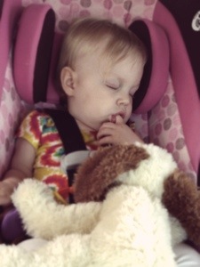 And then of course, the highlight of the trip was all the times I looked back to see her sleeping. Only a parent can understand that immense feeling of love you feel when you watch your child sleep. It’s like someone has poured warm syrup over your head and it slowly trickles down until your entire body feels warm and fuzzy. Normally to get this feeling one must do a lot of sneaking and careful door opening and closing and tiptoeing. That’s the magic of the car. A simple glimpse in the fisheye mirror or over the shoulder can provide this feeling at a moment’s notice. And she slept an amazing amount of time. I of course couldn’t resist snapping a few pictures. So I’ll leave you with them… And the knowledge of why neither of us actually pulled any hair out over the trip… And the reason WHY we survived. Because really, it was quite enjoyable. 85% of the time. The other part? Well, you read about THAT mess yesterday. Or if you didn’t, you can read about it here: https://butterbeesandbumbleflies.wordpress.com/2013/05/28/survival-of-the-parents/. (And by the way, her car seat cleaned up great and so did my car! Like new!)