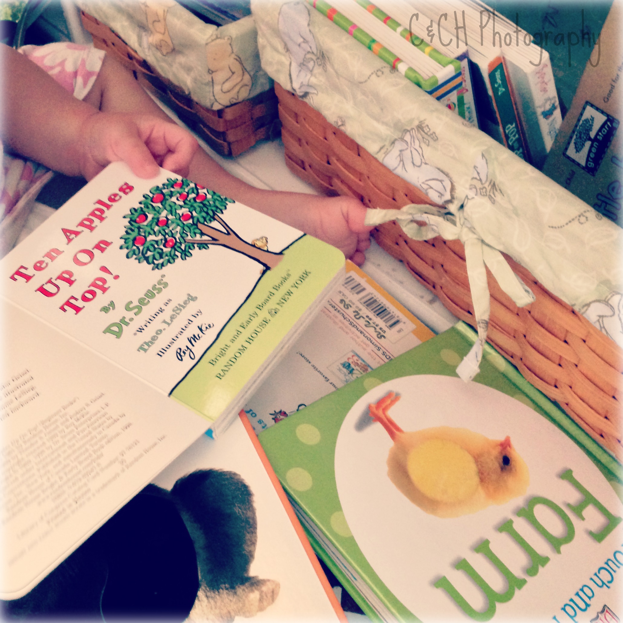 I took several toe pics this morning, and this one ended up being my favorite – can you find the tiny toes amongst all of the books?