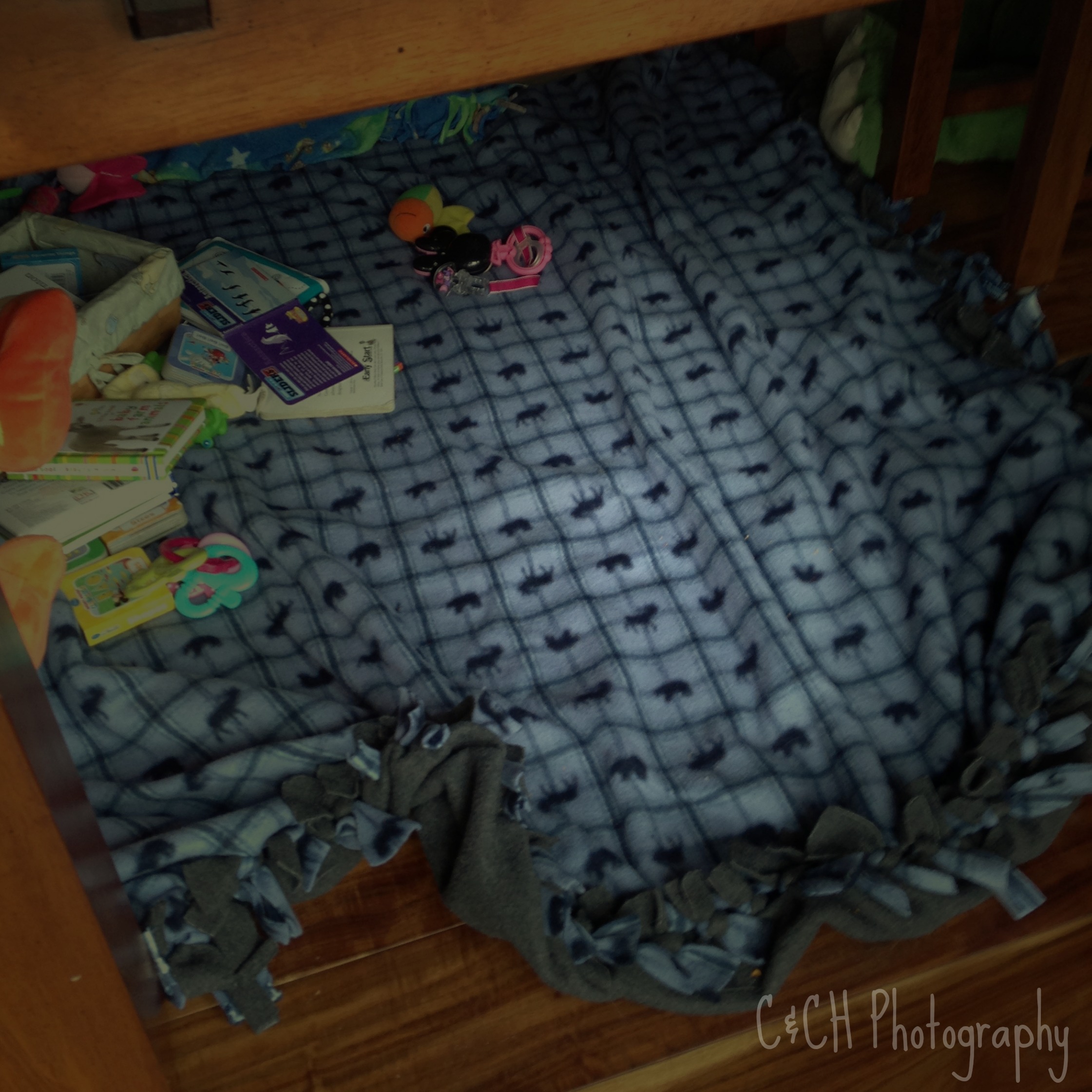 I dearly love fleece. It’s my favorite fabric ever. It’s soft and snuggly, and perfect no matter the weather. If it’s cold outside, snuggle up! If it’s hot outside, turn it cold inside and snuggle up! 🙂 This is one of the MANY fleece blankets I’ve made in my day – currently being used as the floor to our under-the-dining-room-table-fort-that-mommy-should-have-put-away-three-days-ago. 🙂