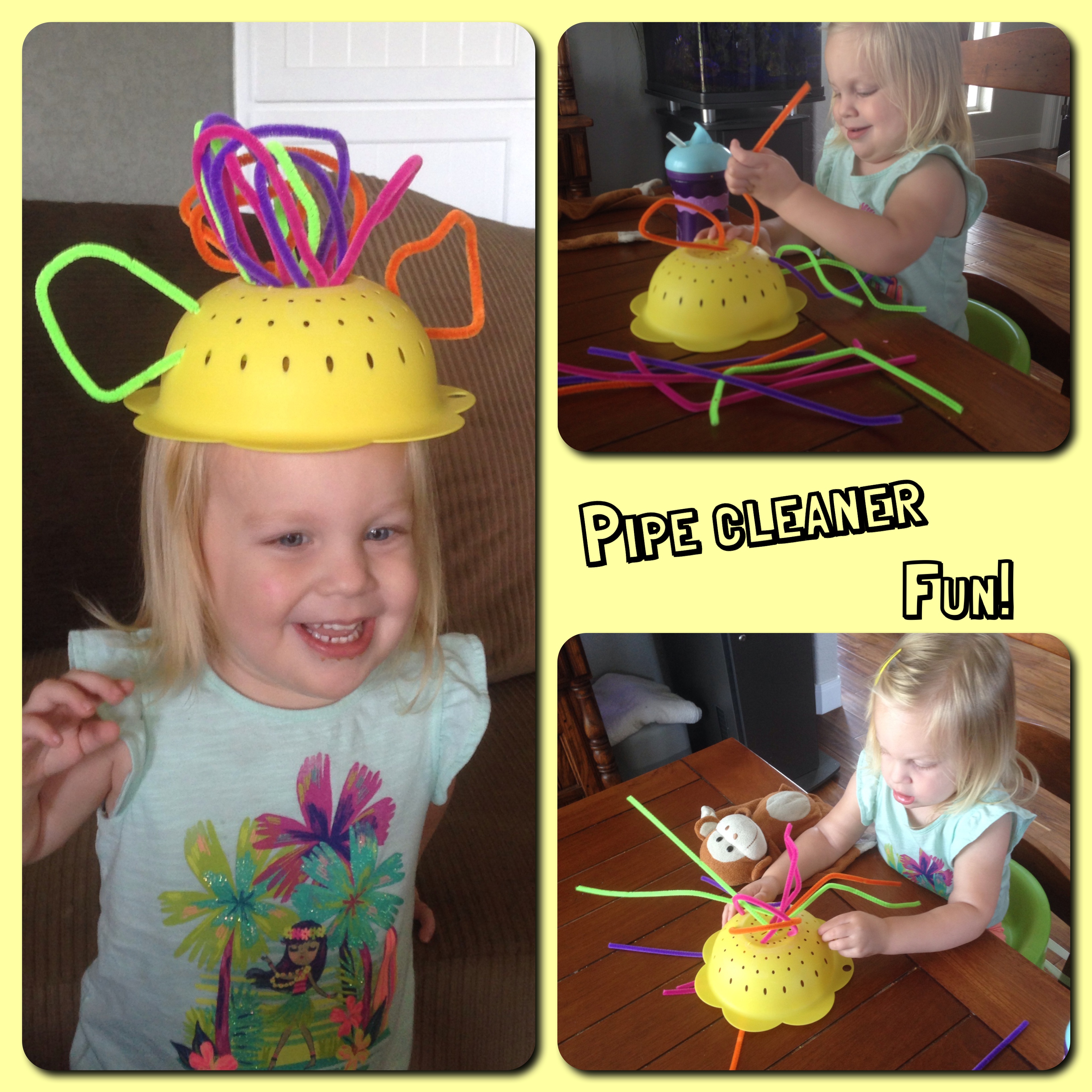 The first one that Becca has fallen in love with is with the colander. This colander I picked up ions ago in the Target dollar section, and it was a favorite bath toy for quite a while. Then it just sorta became a holder for more bath toys. Now it has purpose once again! She LOVES threading the pipe cleaners into the holes (the holes are too small for straws, as listed in the blog above). The first time I introduced the activity, she played for 30 full minutes before moving on to a different activity! Woohoo! (And it’s great for her hand-eye coordination and fine motor skills, too!) The larger picture in the collage came with help from Mommy – we made ears and hair for her hat. She LOVED it! I love the giggles that came from this fun play time, and it was fun for me to play with her doing something other than running cars on a mat, again. For the millionth time. 🙂