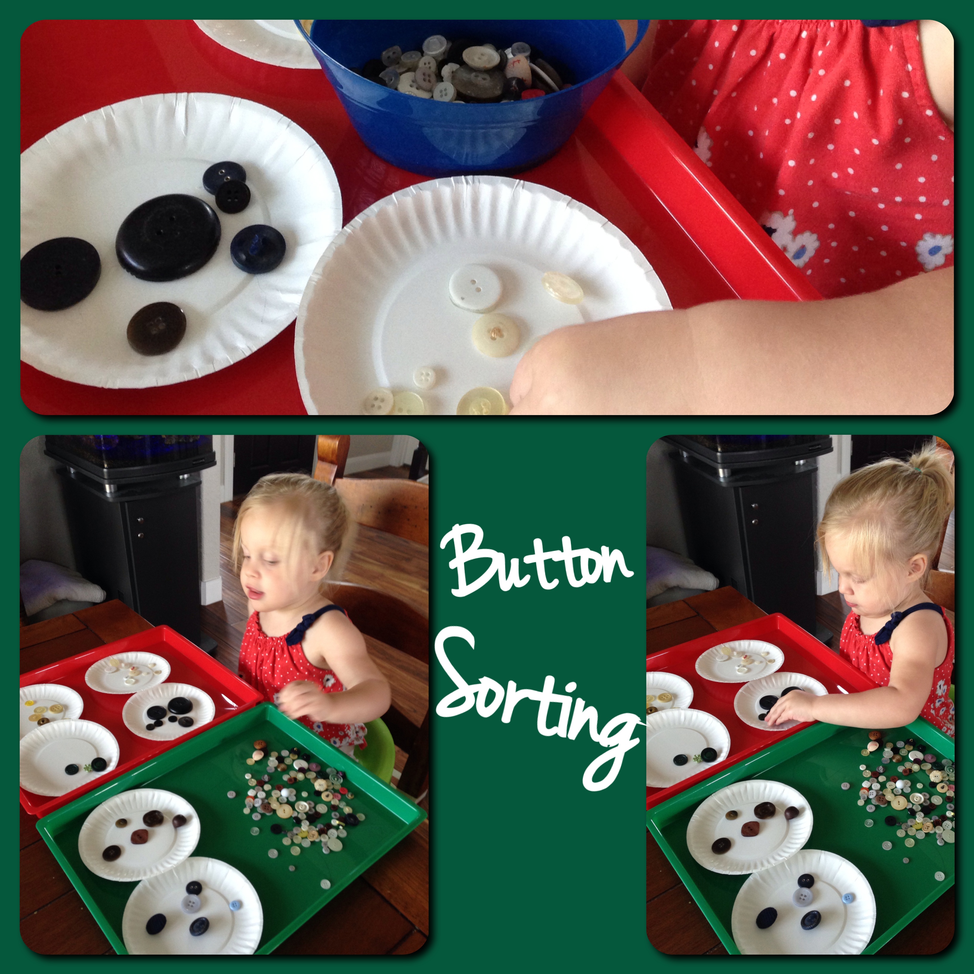 Another idea that she had on the blog was putting ribbon in a bottle. I love that idea and can’t wait to try it, but it got me thinking – what else could she put in a bottle… until I realized it was recycling day and the bottles were already gone! So, I began thinking about buttons, and decided to try a button sorting activity with her. I discovered that I gave her too many small buttons for her patience/attention span, and instead of just digging my hand in the button box, I SHOULD have carefully selected some really cool ones for her. Live and learn… and make changes for next time. But, she did love the button sorting, and now that she’s done it with supervision, she should be able to replicate the result on her own.