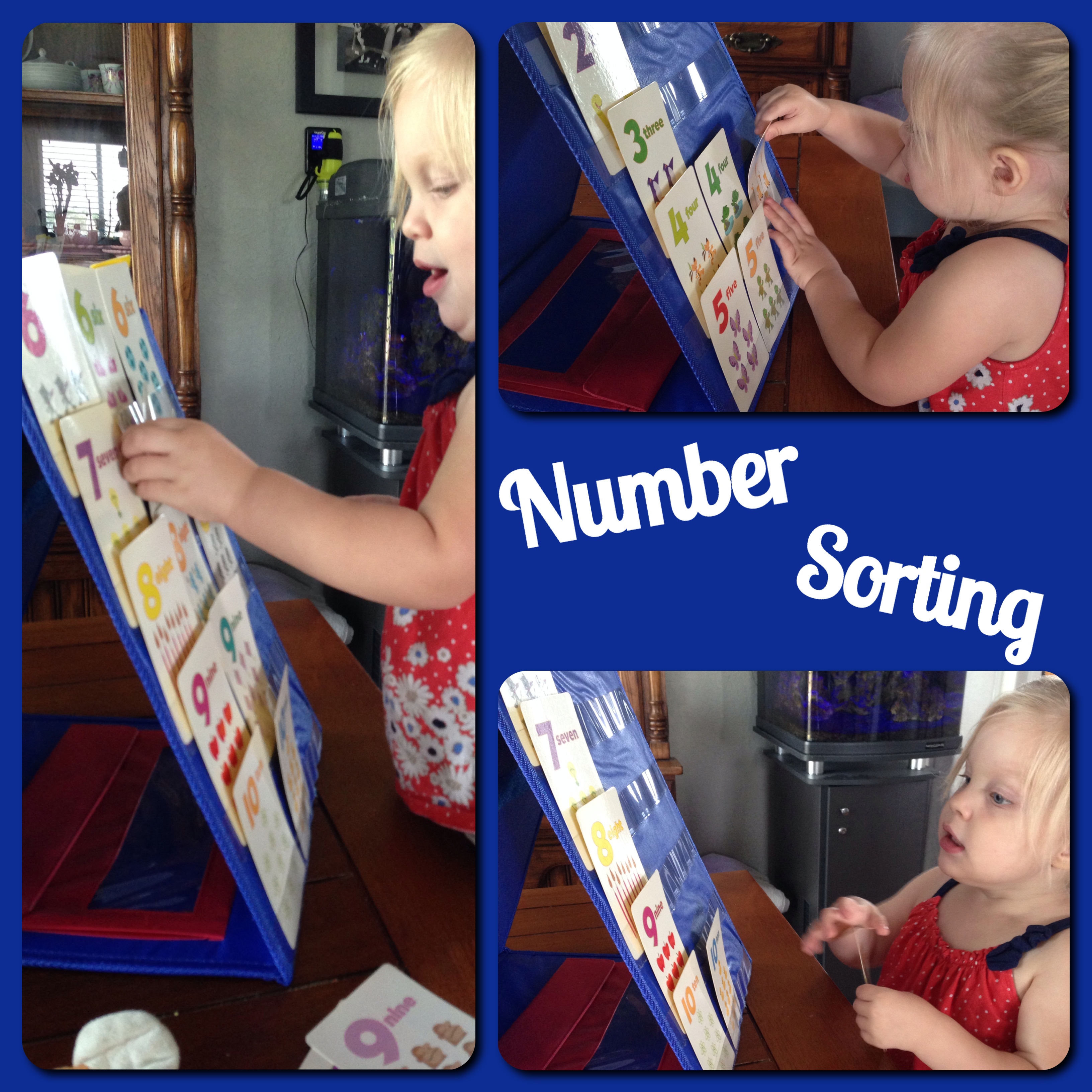While I was upstairs digging in the button box, my eyes fell on these number cards from a Go Fish game I bought at Dollar Tree and laminated for durability. So, I pulled them out along with our stand up pocket chart ( buy yours here), and put one in each pocket, and had her sort the numbers and put them in the correct row. In all of her brilliance, she has trouble putting things in rows. Her brain just doesn’t work that way. She wants to put things in piles, not lay them out next to each other. So this is a definite skill to work on – as well as the fabulous hand-eye and fine motor coordination skills of putting cards into a pocket chart. She loved it. My only complaint was that there aren’t enough pockets to include the numbers 11 and 12, which also came in our deck. So, I had her just do them on the table.