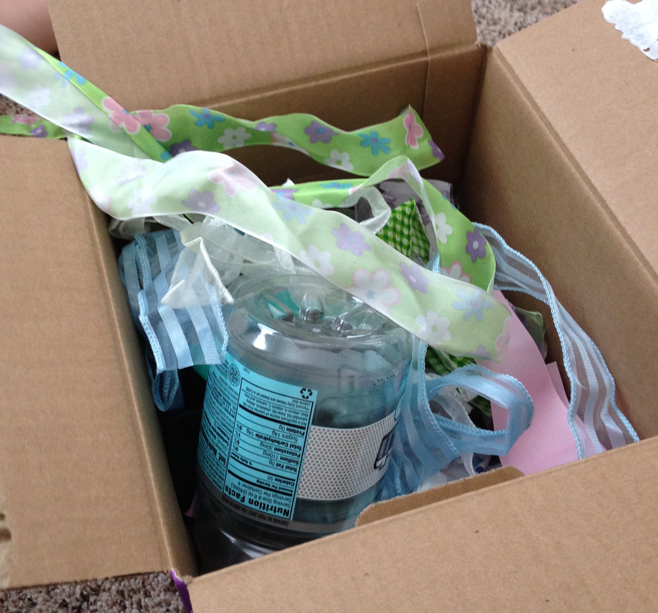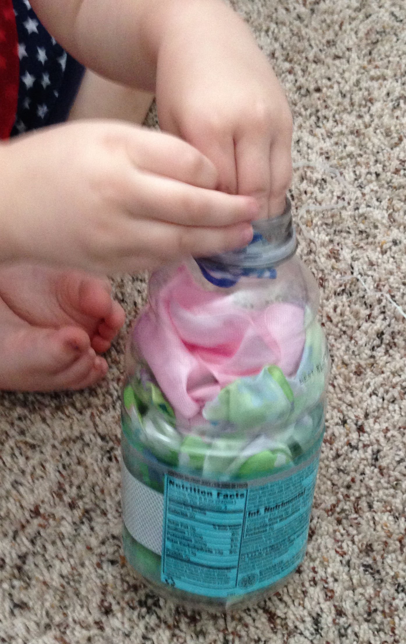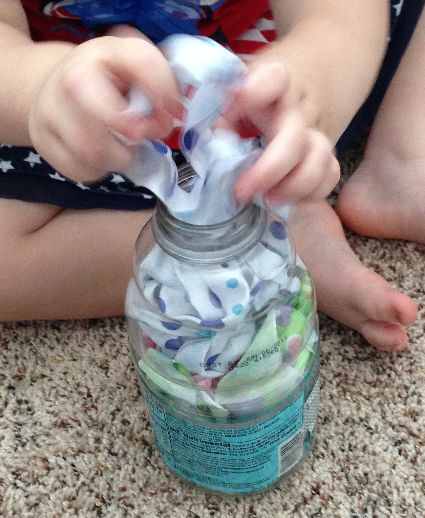 We tried stuffing ribbons in a bottle. She enjoyed it, but really struggled to get them in – definitely a great test of her fine motor abilities! I highly recommend trying it. As you can see, we used a bottle with a wider mouth (like a Gatorade bottle) instead of a water bottle – that would have been impossible for her. And still, I had to help a lot. She had fun with it, but got frustrated quickly – we only played maybe five minutes. We’ll try it again soon. I just need to figure out how to get out all the ribbon we stuffed in… I think I need a dowel rod…