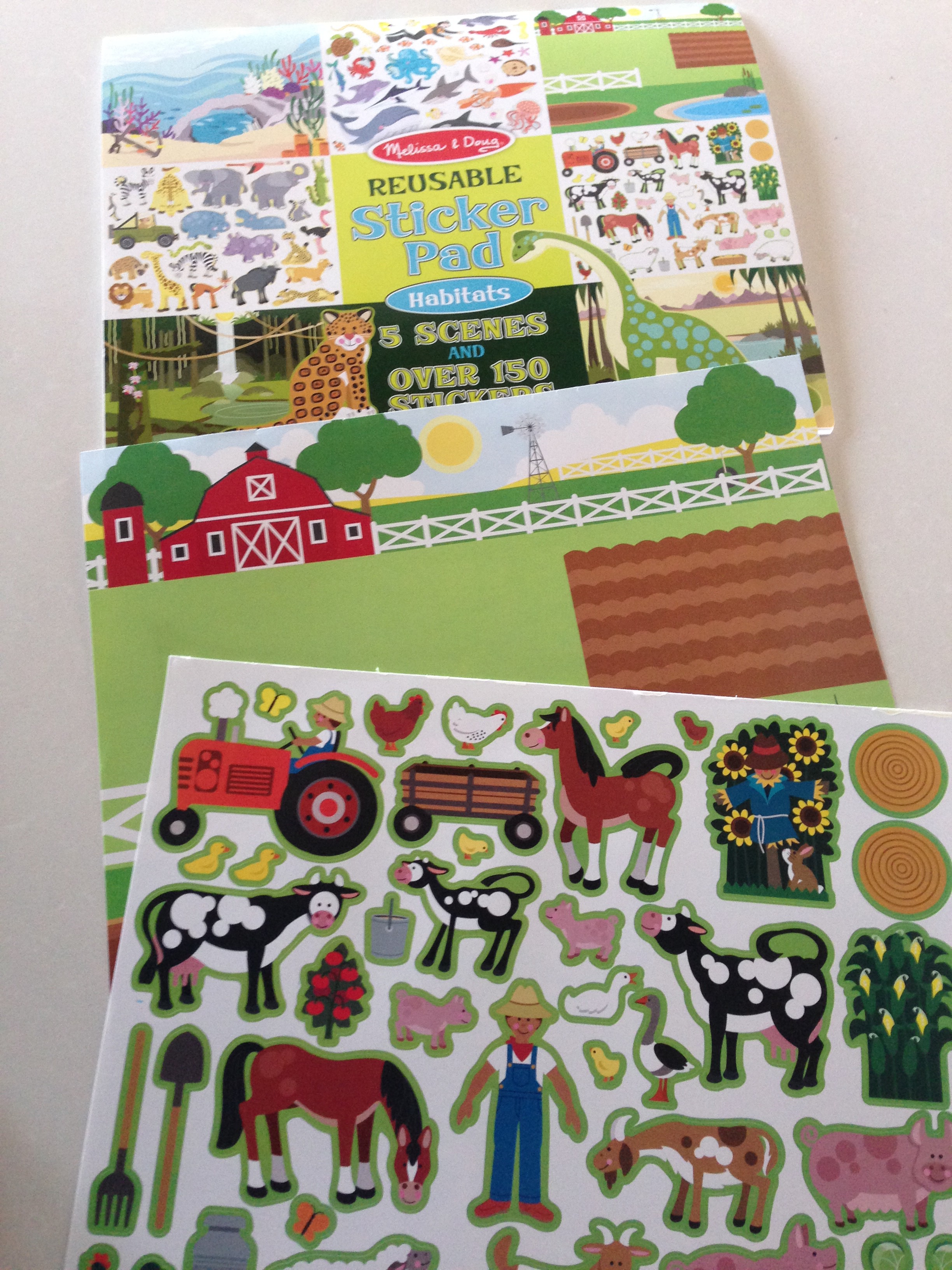 The kids are blessed with a Granny who sends them boxes of fun random items at random times. And at one point, in one of Becca’s boxes came one of Melissa and Doug’s most creative (in my opinion) products that inspires creativity in kids… it’s the Reusable Sticker pad. You can get your own here on Amazon (affiliate link). The one I’ve linked is the one Becca has – the habitats one, shown below, but there are others available as well.