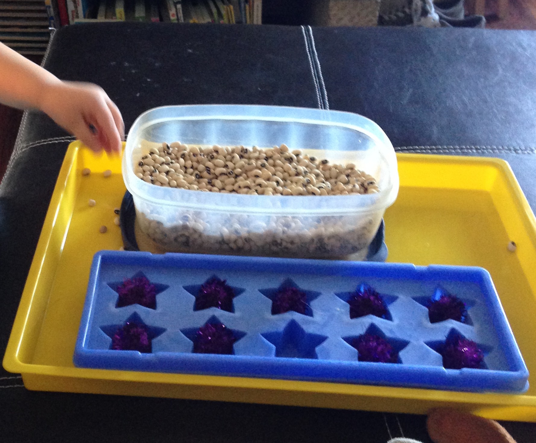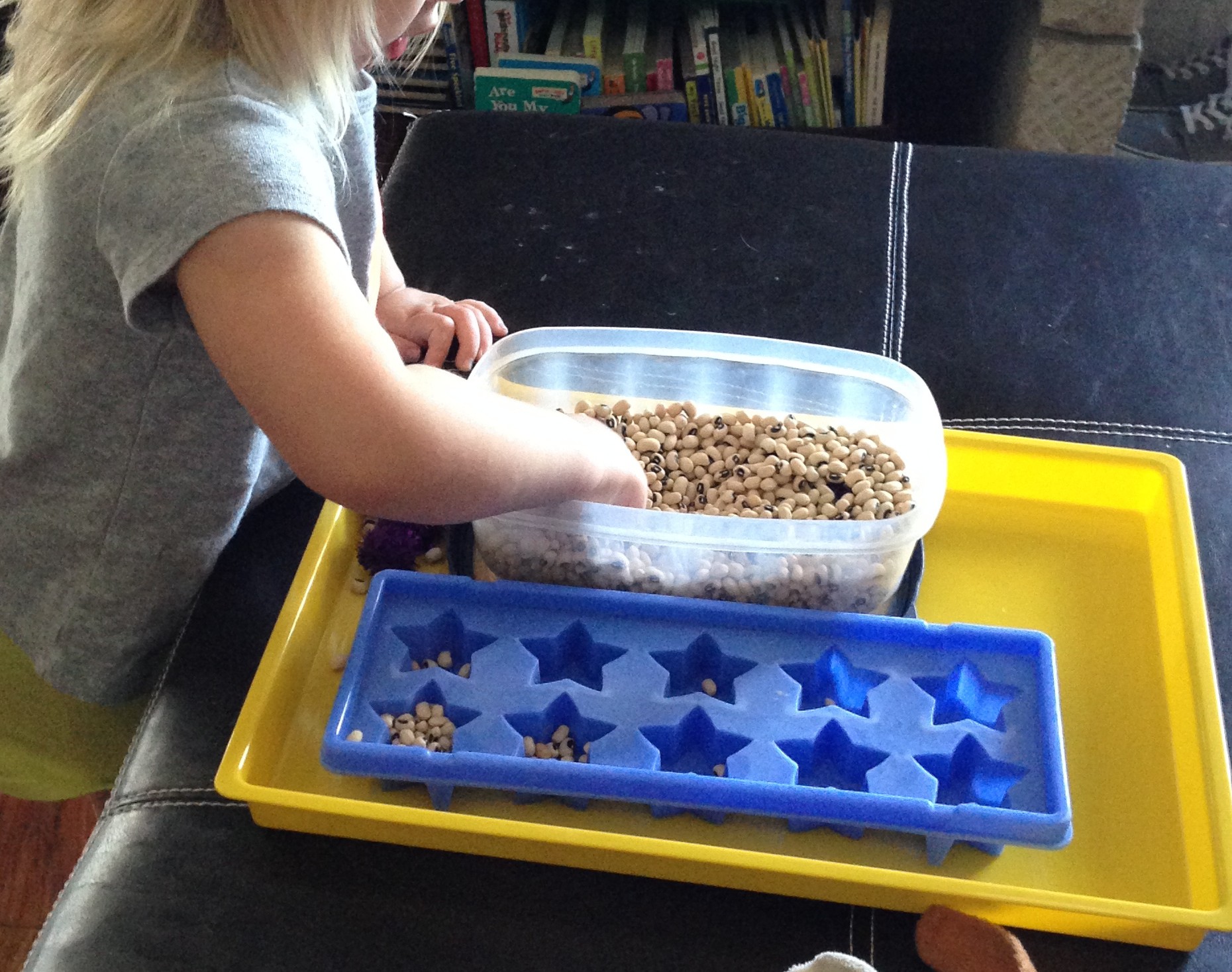 Then, I went and got this ice cube tray and gave it to her to see what she would do. Without being prompted, she began to fill the holes with beans. She really enjoyed taking the beans in and out of the stars. I was surprised how focused she was on the beans, not the pom poms. But, I think it’s because she’s played with them before – the beans were new.