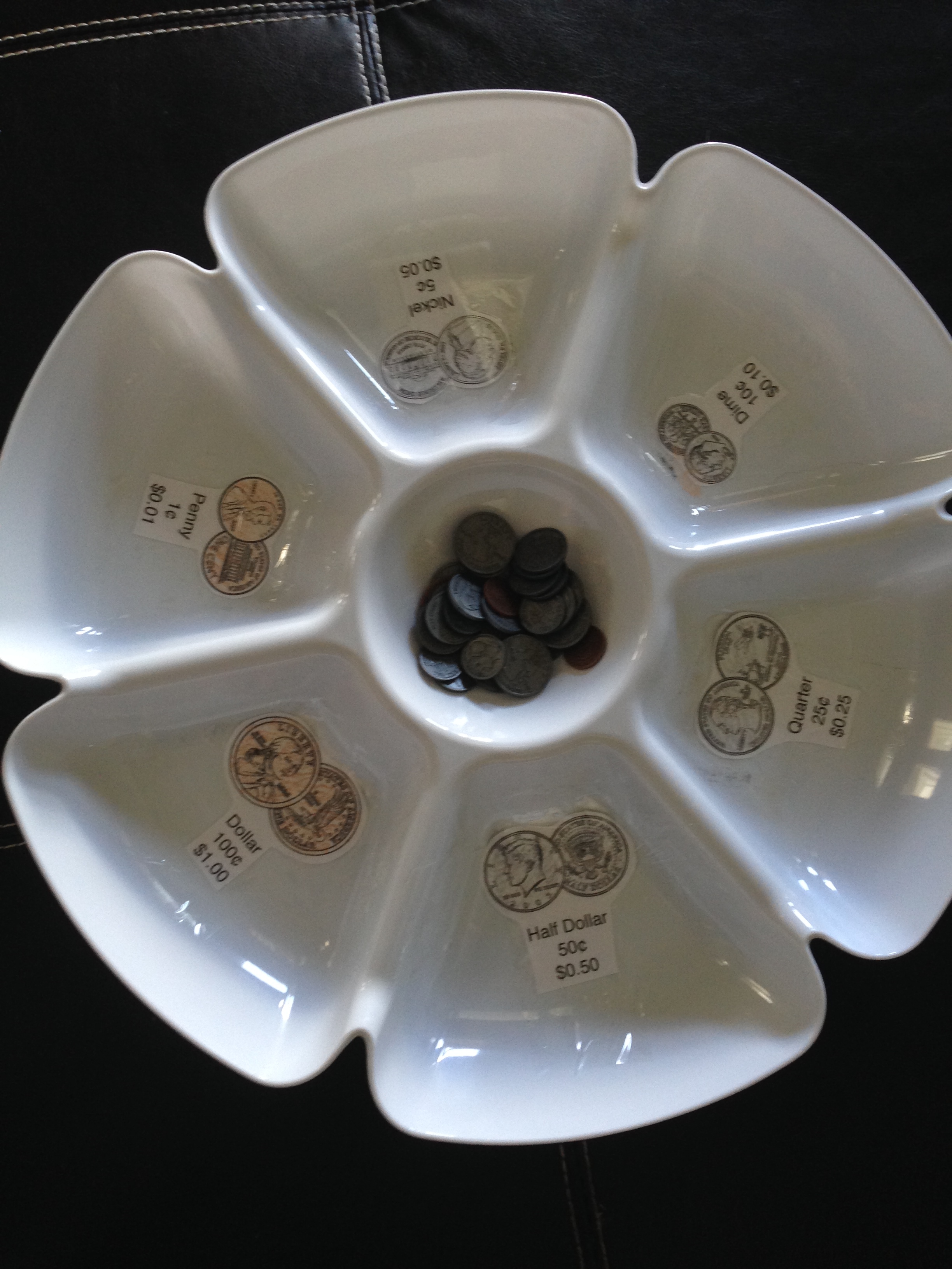 Anyway, I digressed. I wanted to find a way to introduce the coins and their values that would be fun and simple now, but could grow more complex with her understanding. Enter the fabulous veggie and dip tray. (Again, with the sound of angels.)