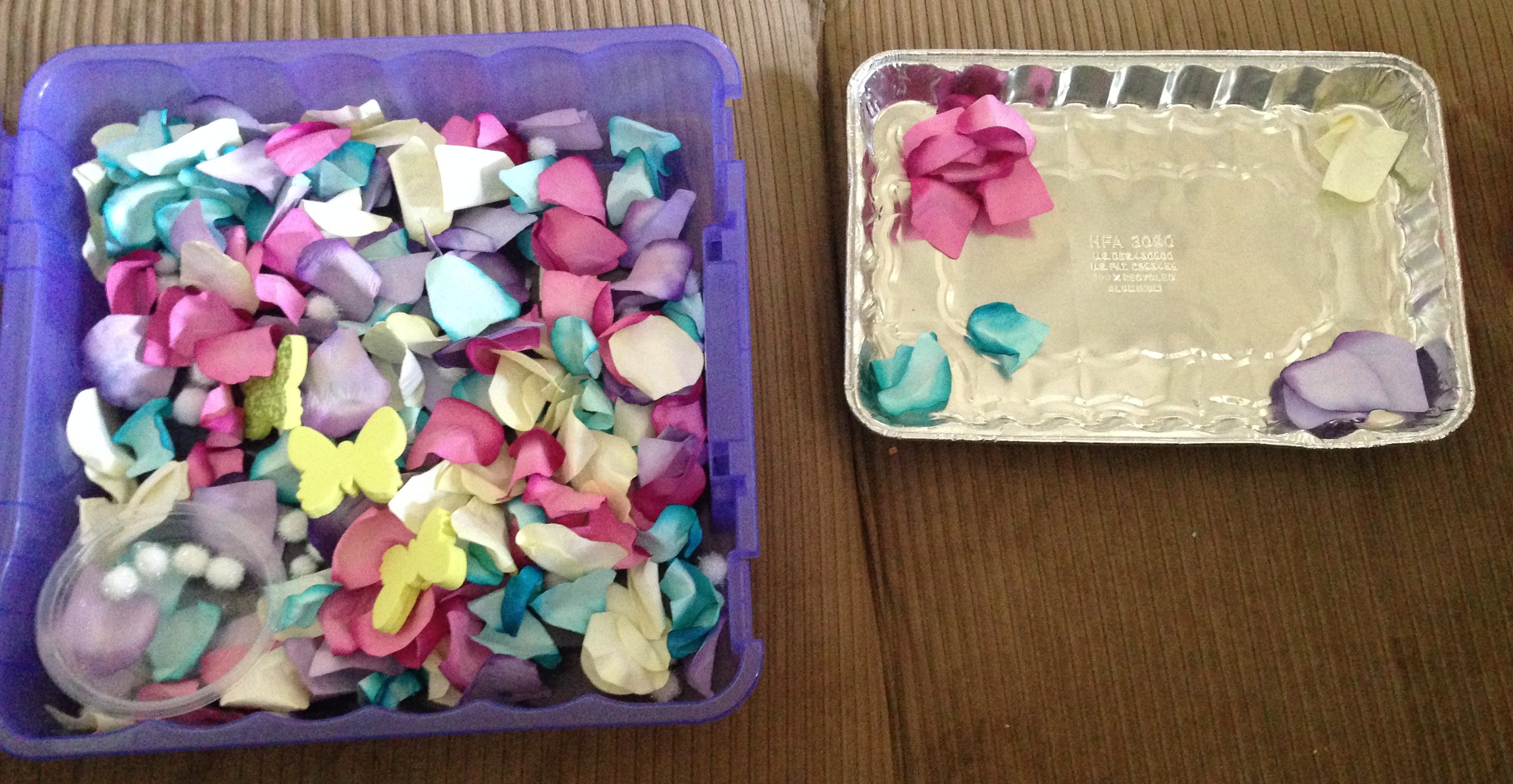 So what did I put inside mine? I got paper flower petals from www.consumercrafts.com (not an affiliate link, but it seriously should be as much as I love their stuff and tell everyone in the world about their website…), threw in some little white shiny poms for a different texture, and then did what I’m starting to become famous for – took foam butterfly stickers and stuck them together to create some nice thick, cushy foam butterflies.