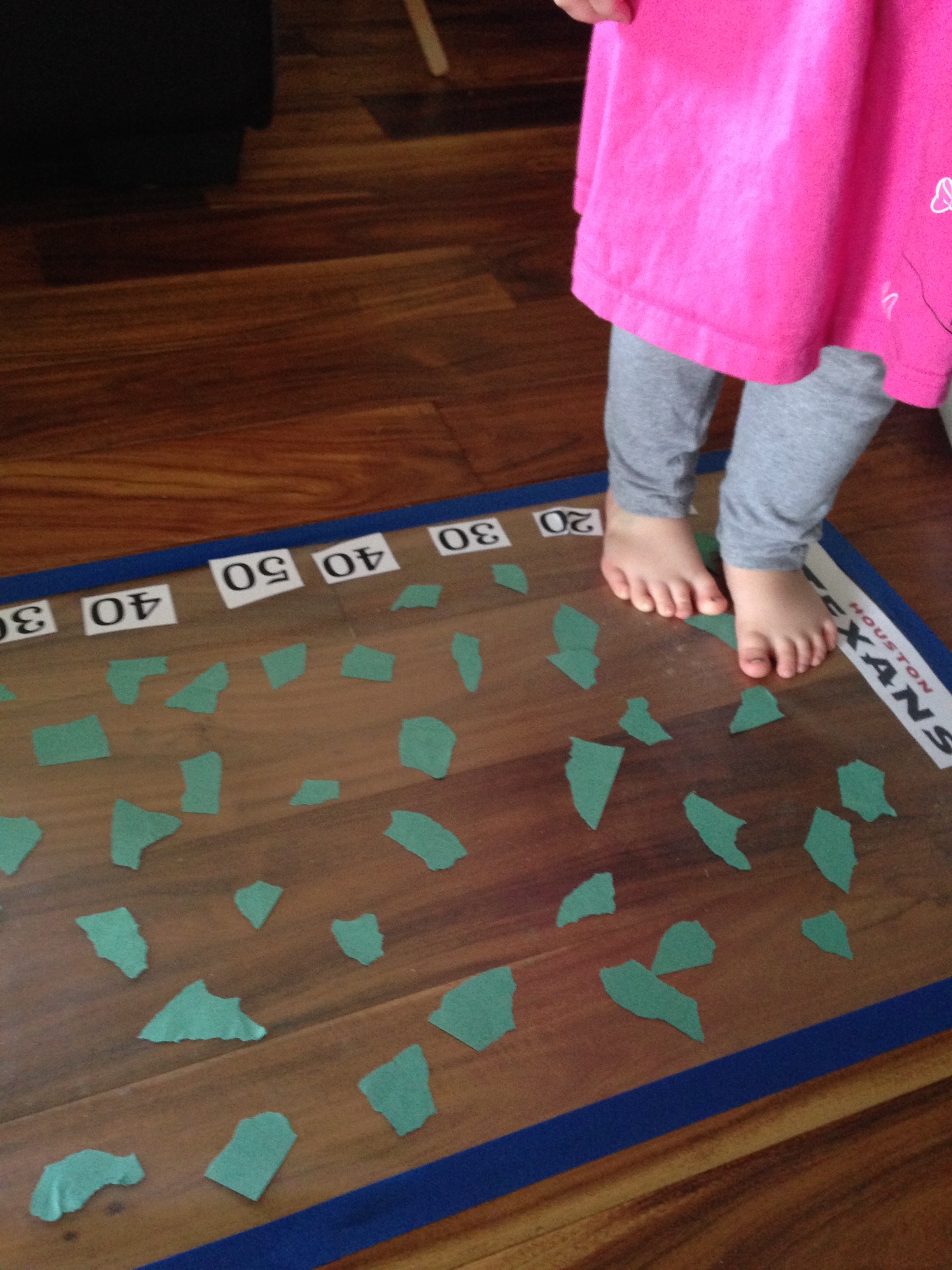 Here’s what I did – I printed off two end zone signs for our favorite team (#WEARETEXANS), and printed off the sideline numbers (you could easily print them for both sides – I just did one). I laid out the contact paper on the floor, and taped it down with painter’s tape (don’t use masking or you’ll leave residue on your floor!). Then I laid down one end zone sign, and Becca placed the other. I put down the 10 and 30, she put down the 20. I put down the 50, she put down the 40. Until all the numbers were down. Then we counted them by 10s. Then, we ripped green paper for grass, and sprinkled them all over the “field”, and she began to walk on it. She LOVES the stickiness on her feet! She says it feels cool. It’s also super fun to run cars on because they make a great sound, and she loves to roll the football across it because that makes yet another cool sound!