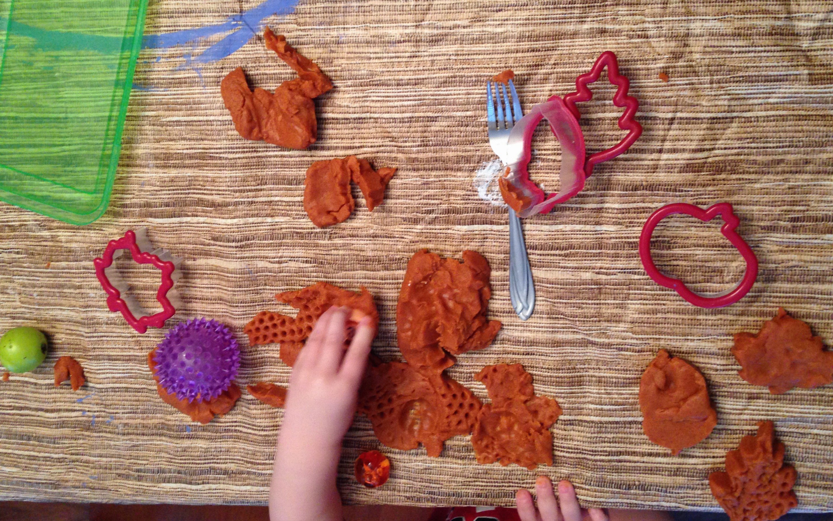 First it was the fork, then a little pumpkin bead, then her spiky ball, then a food pouch lid, then a play apple… she took time to press each thing into the play dough to see what response she got from the item, and from the dough.  She noticed that the play dough wanted to stick to the spiky ball, but the plastic bead came right out… both left neat impressions.  The food pouch lid was just a mess.  It left a neat impression, but brought back a bunch of play dough stuck inside.  The apple was most disappointing to her – because she did it last, and it’s smooth surface “wiped away my holes!”  The spiky ball had left such a neat pattern, and then suddenly it was gone!