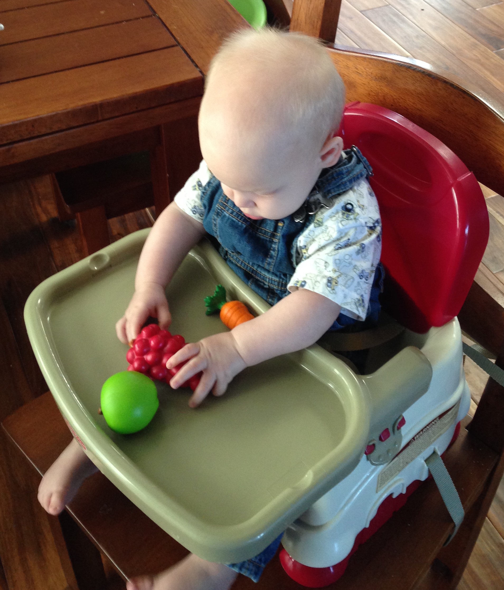 I love that the fruits and veggies are bright colors and have a variety of textures, so he’s getting a great sensory experience while playing with them. And I love that they are big enough to really work his motor skills as well as his hand-eye coordination – while being safe… he isn’t going to choke on any of these items. Sister also loves to play WITH him – she will bring him the right color bucket and help him drop them in! She is also great about picking up the ones he drops on the floor (because that happens a lot)!