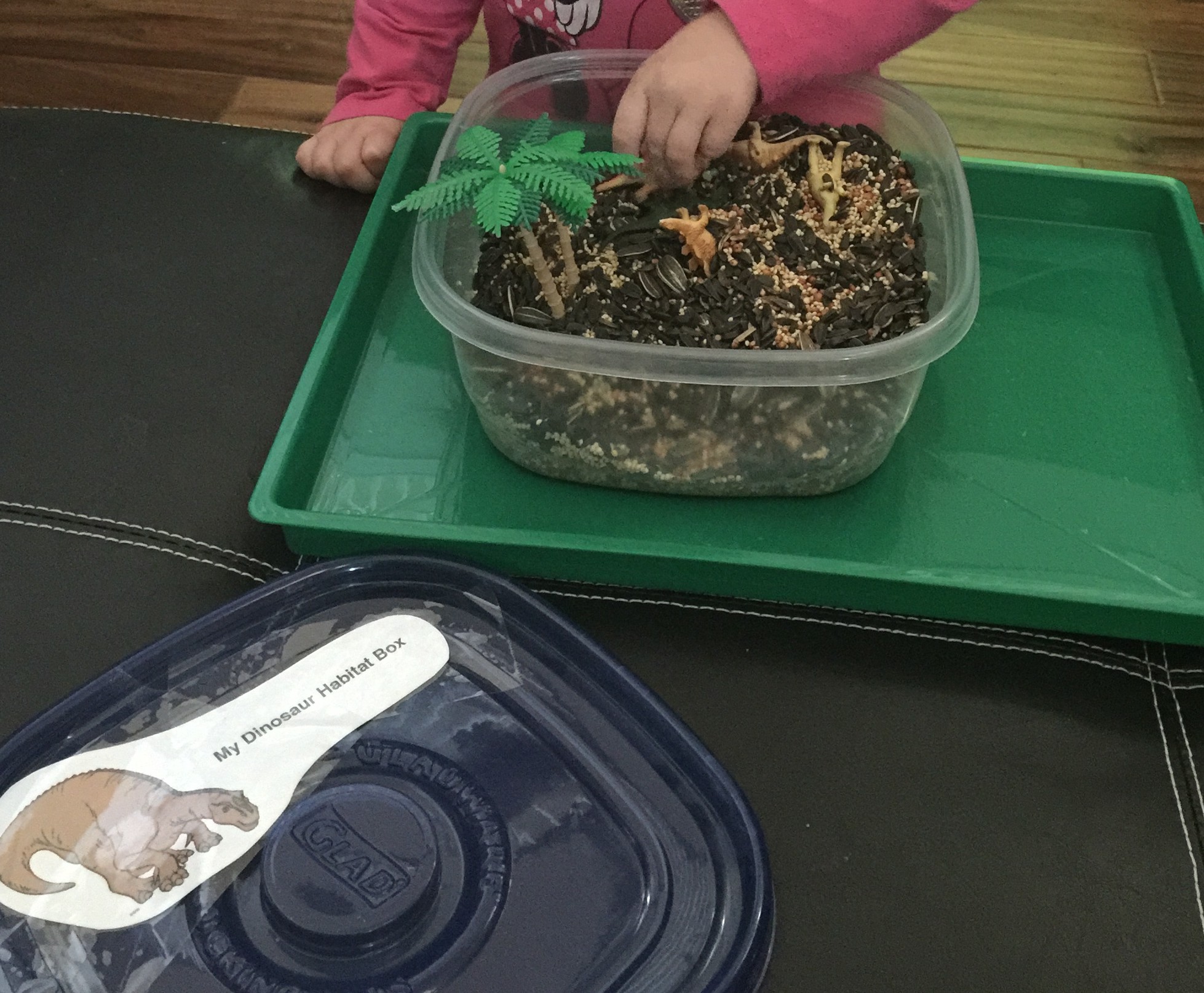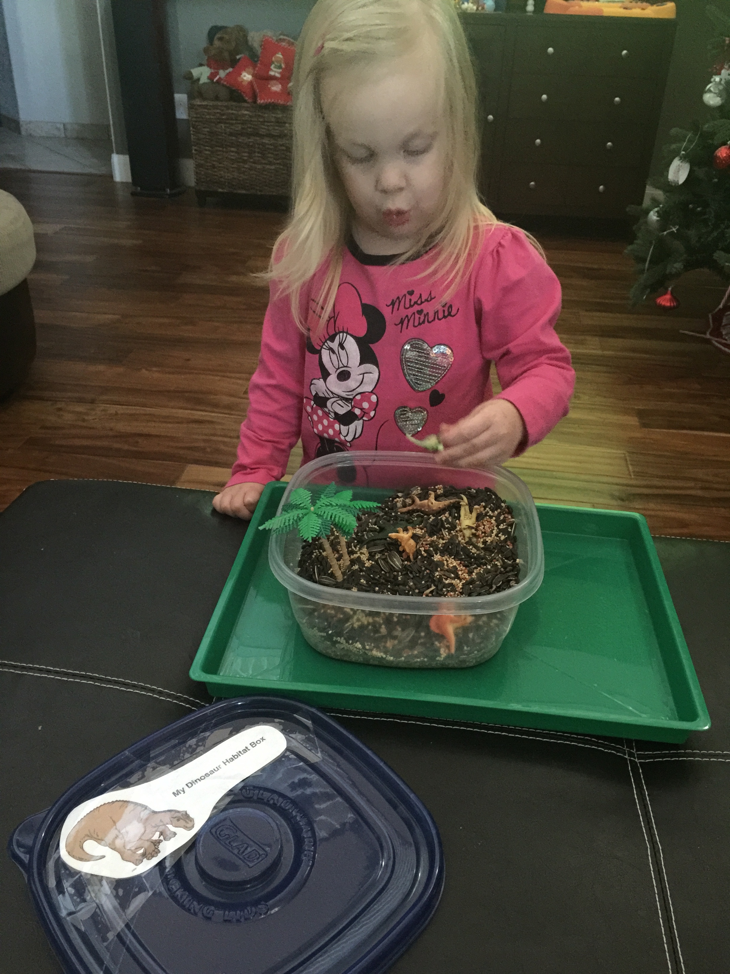 Due to a lack of good storage/organization/planning on my part, we have a TON of wild bird seed. So it made a perfect base for her Dinosaur habitat! Add in a dinosaur Toob (Safari Ltd Dinos TOOB aff link here), a couple of palm trees from Party City, and you’re good to go!