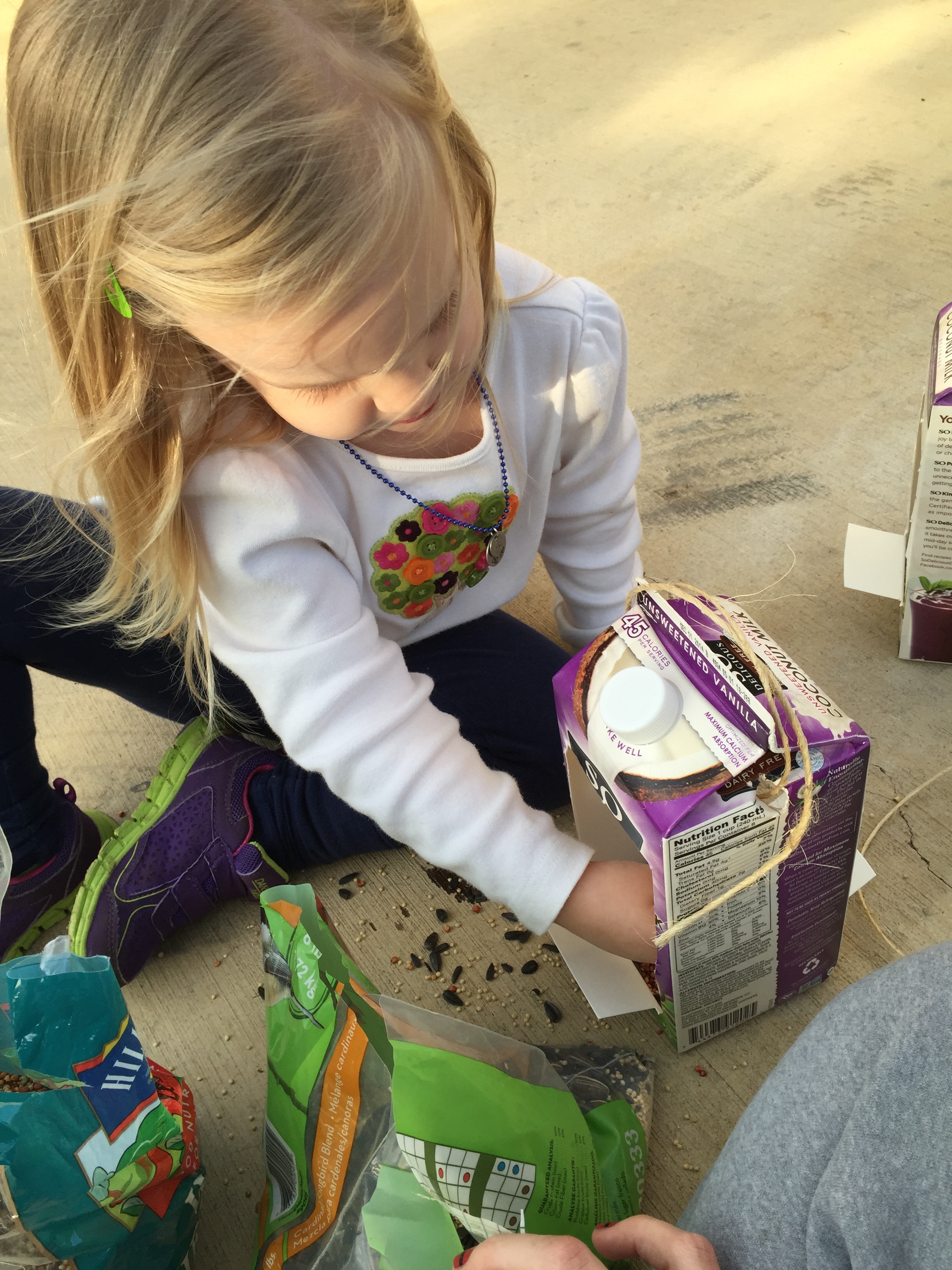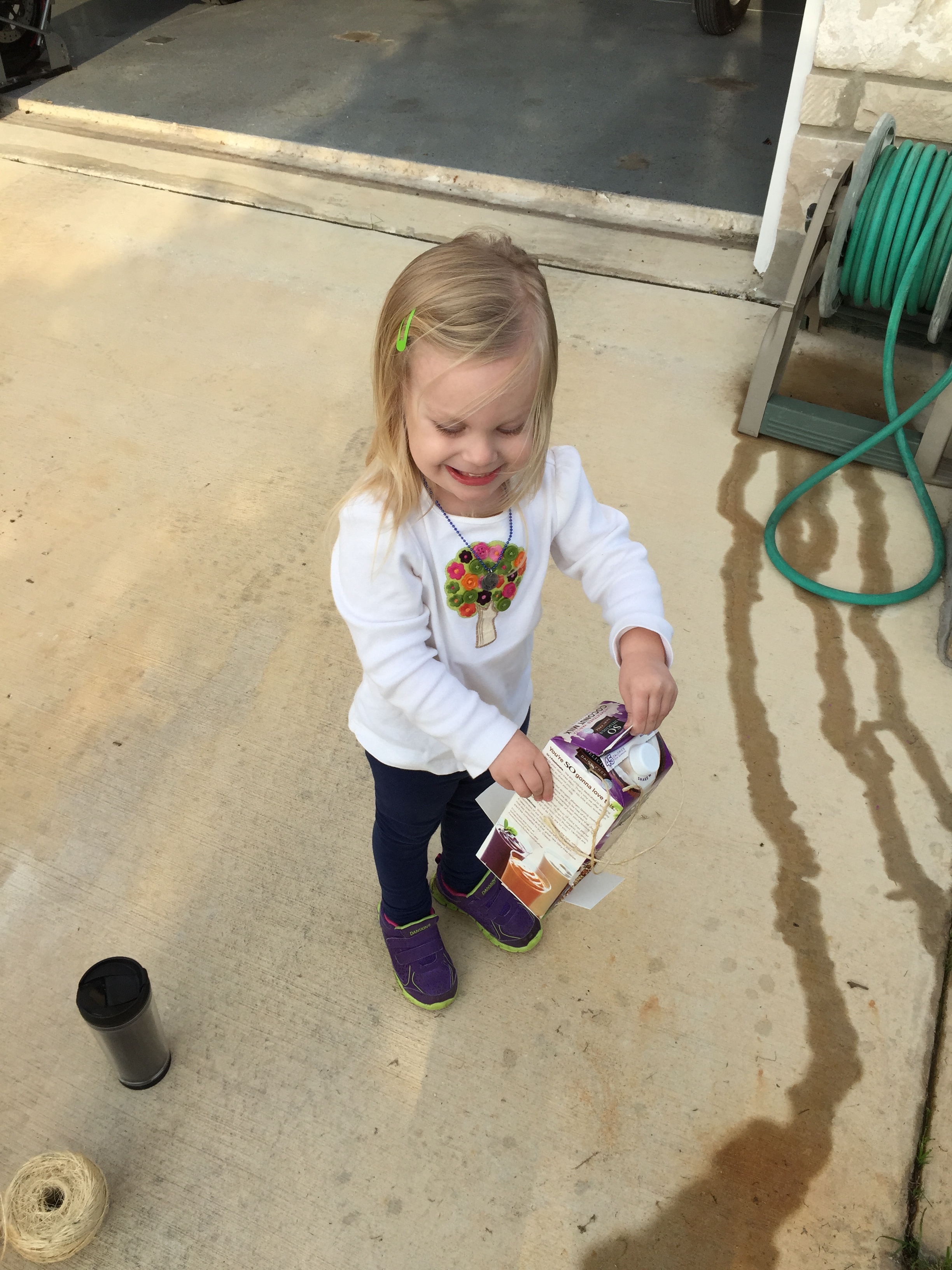 Becca LOVES to be outside. And she loves watching birds. So this winter on a somewhat warmer day, I made a couple of bird feeders out of milk jugs and Becca helped fill them up with bird seed, and we hung them in a couple of our trees in the front yard. We’ve checked them and refilled them a couple of times, and she’s always so happy to see that the birds have been eating the food she puts out for them. These are super simple, basic feeders – just cut a rectangle in two sides of a paper milk carton, then cut slits a little further down, and fold down a little flap for the birds to sit on. Poke holes in the top for your string, fill them up, and you’re ready to tie them to the tree and go!