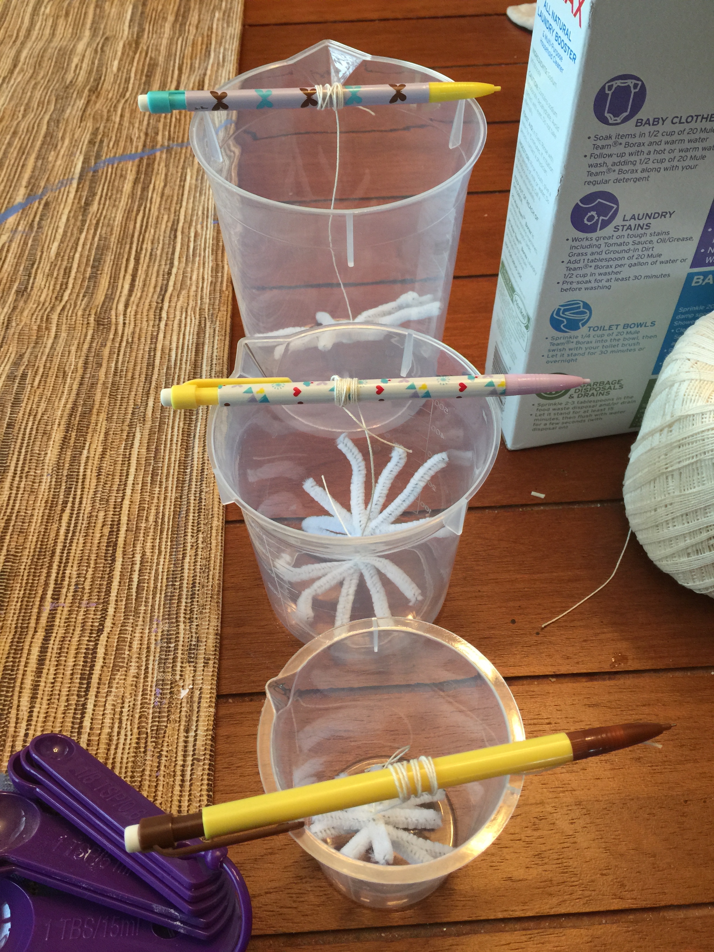 I just cut and twisted the pipe cleaners into snowflakes and then, we followed the directions on the Noirin’s post (linked above) to make our crystal snowflakes!! They turned out super awesome and Becca has really enjoyed looking at them over and over and touching them. Now I need to figure out what to do with them, because I don’t want to just throw them away…