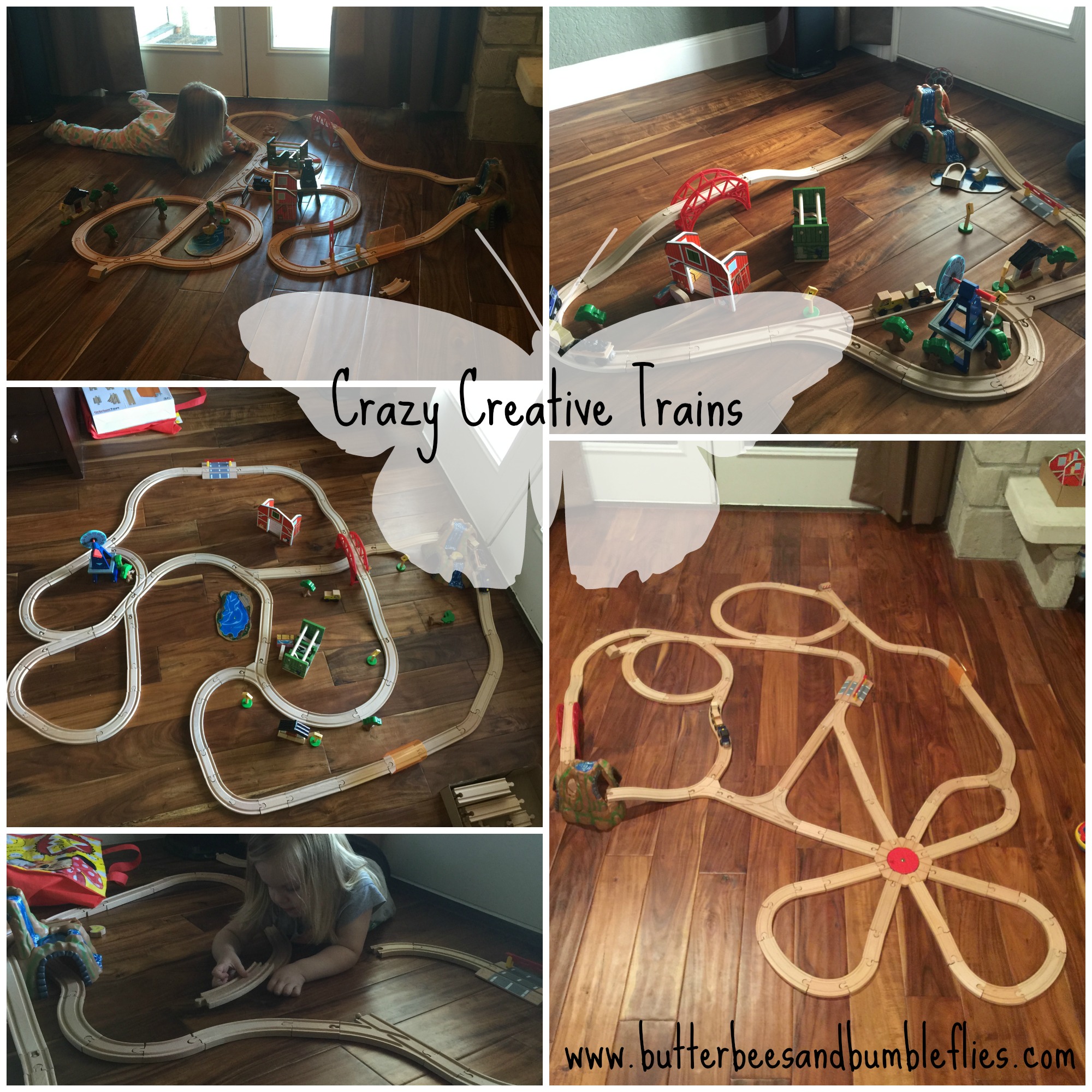 First of all, if you don’t have a wooden train set for your preschool/elementary/middle/high children and you/hubby… well, your whole family will love having a train set! Heck, Grayson even loves the train set… (he’s head of the demolition crew after we build something!)