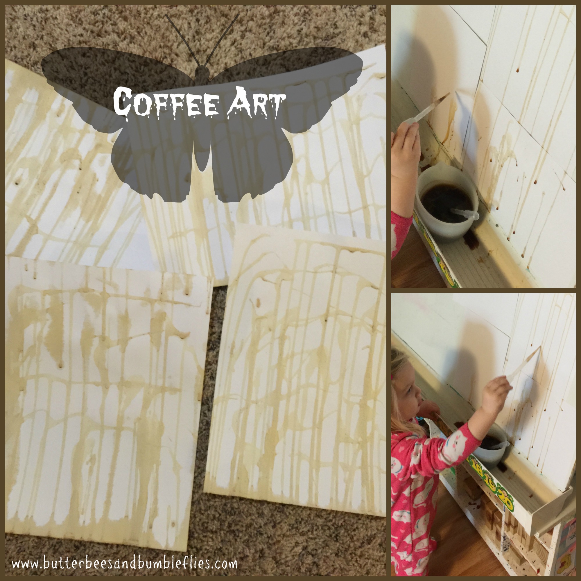 I recently learned from a friend the benefits of adding used coffee grounds to the soil in my flower beds – the nitrogen really helps enrich the soil. And, I had a bunch of old coffee that I had found in the back of my fridge that I had just stuck in the pantry thinking I’d do something with it someday. So, rather than take the time and put the wear on my coffee maker to make up like 10 pots of coffee, I just dumped the grounds into a tin carton and added some hot water. Then I got to thinking – I bet this would make some really cool coffee “stains” on white paper. So, I strained a little of the water off, and Becca and I used Pipettes (aff link – thank you!) at the easel to drip the coffee down onto the paper. And the result was really cool. We had a blast. And as a bonus, it smelled good!