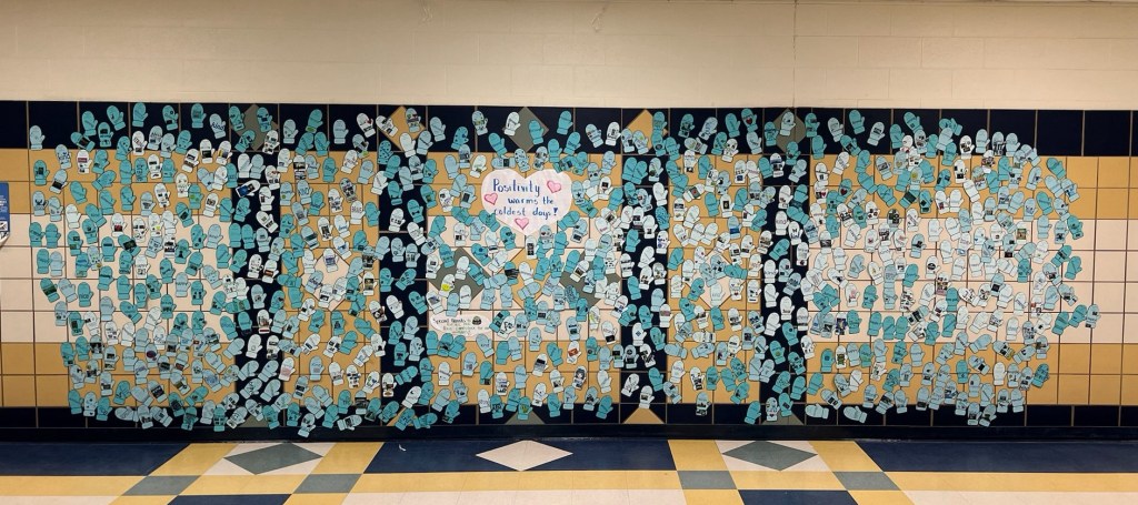 2) Due to privacy laws, we can’t have student work posted in the main hallway with last names or major identifying features. SO! I assigned each classroom teacher a number, and had students put that number next to their first name on their mitten, so that when they come down off the wall in a few weeks, I can get them back to them to take home. With over 700 students, we have LOTS of repeat names… and I’m not going to hunt down the 5 Grayson’s and see whose is whose! (Using that example, b/c that’s my son’s name.)