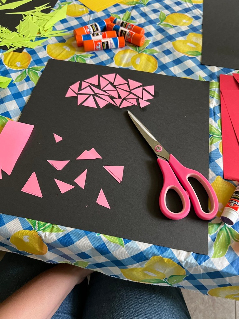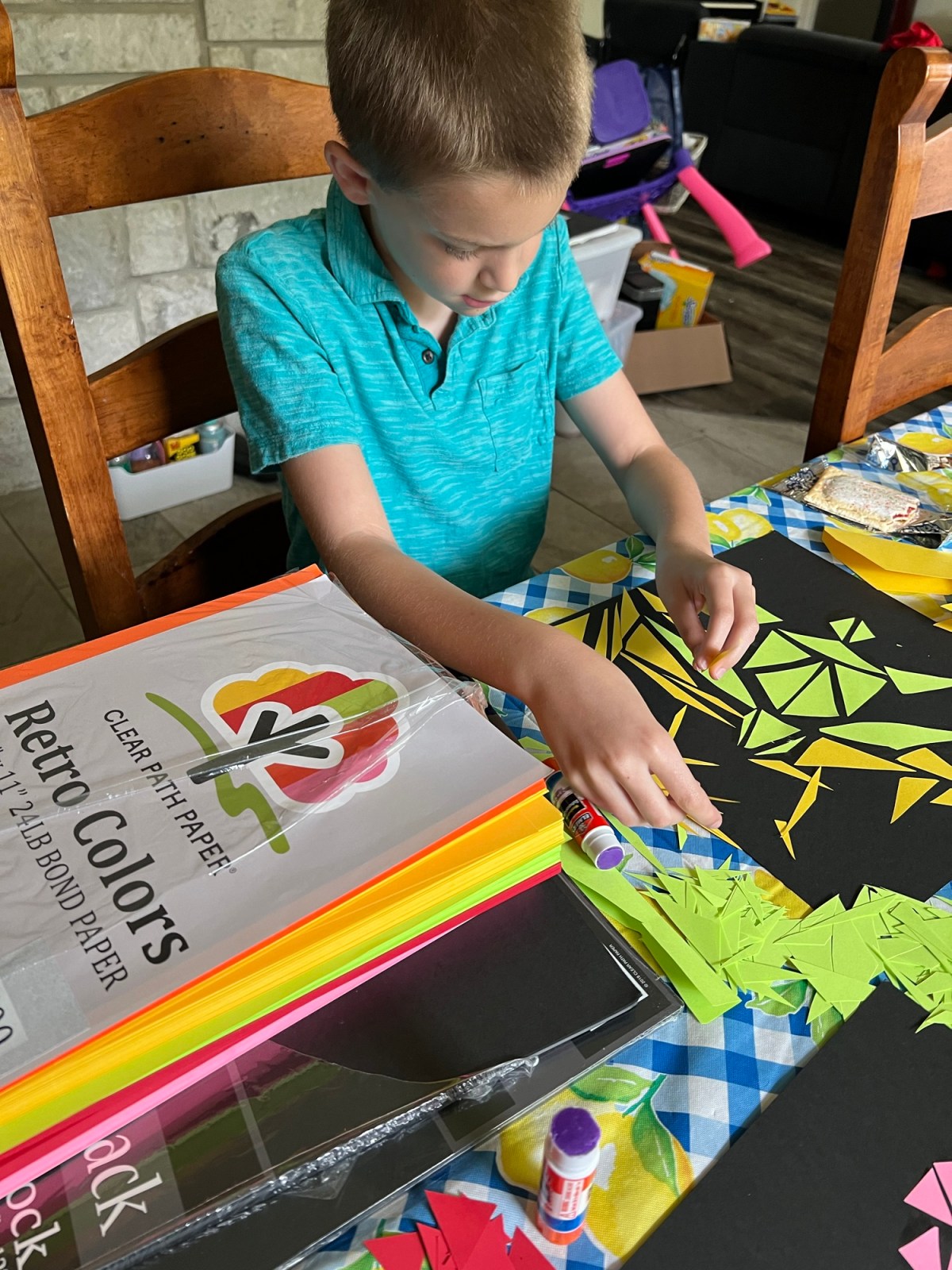 So, I got with Andrew and told him my idea… and once again, Clear Path came thru and made it happen! Their black cardstock is perfect to attach to, and the Retro Colors Mixed Pack just screams summer! My kiddos loved researching Yayoi Kusama, and had never encountered her particular style of art. We just kept enjoying more and more images from our Google search! I set the Retro Colors pack in front of the kids and told them to “think summer and triangles with polka dots.”
