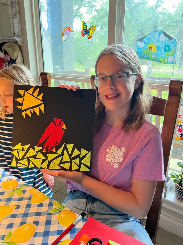 We first grabbed paper and started cutting triangles of all sizes. Both the older kids immediately had a picture in their head that they wanted to make. Elle didn’t really understand the concept, but she had fun cutting and gluing paper. (So I recommed this project for 4th grade and up!) The older two really took the idea and ran with their own concepts, but we didn’t tell each other what we were trying to make… and the three of us enjoyed guessing where the others were going with our art!
