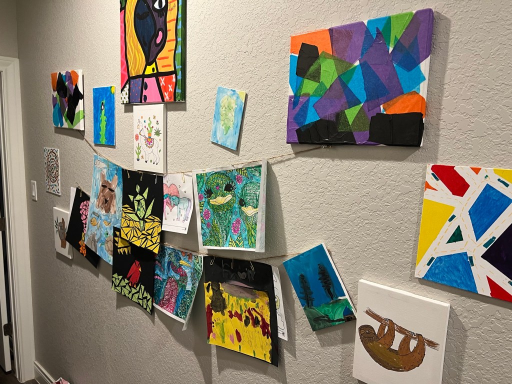 After our glue had fully dried, we went back and painted the polka dots by using the back side of paint brushes of various sizes, and a wide variety of paints we had in the art closet. They then enjoyed hanging them on our ever-changing art wall in their bedroom hallway, so they can enjoy seeing them for a few months til we hang up new art!