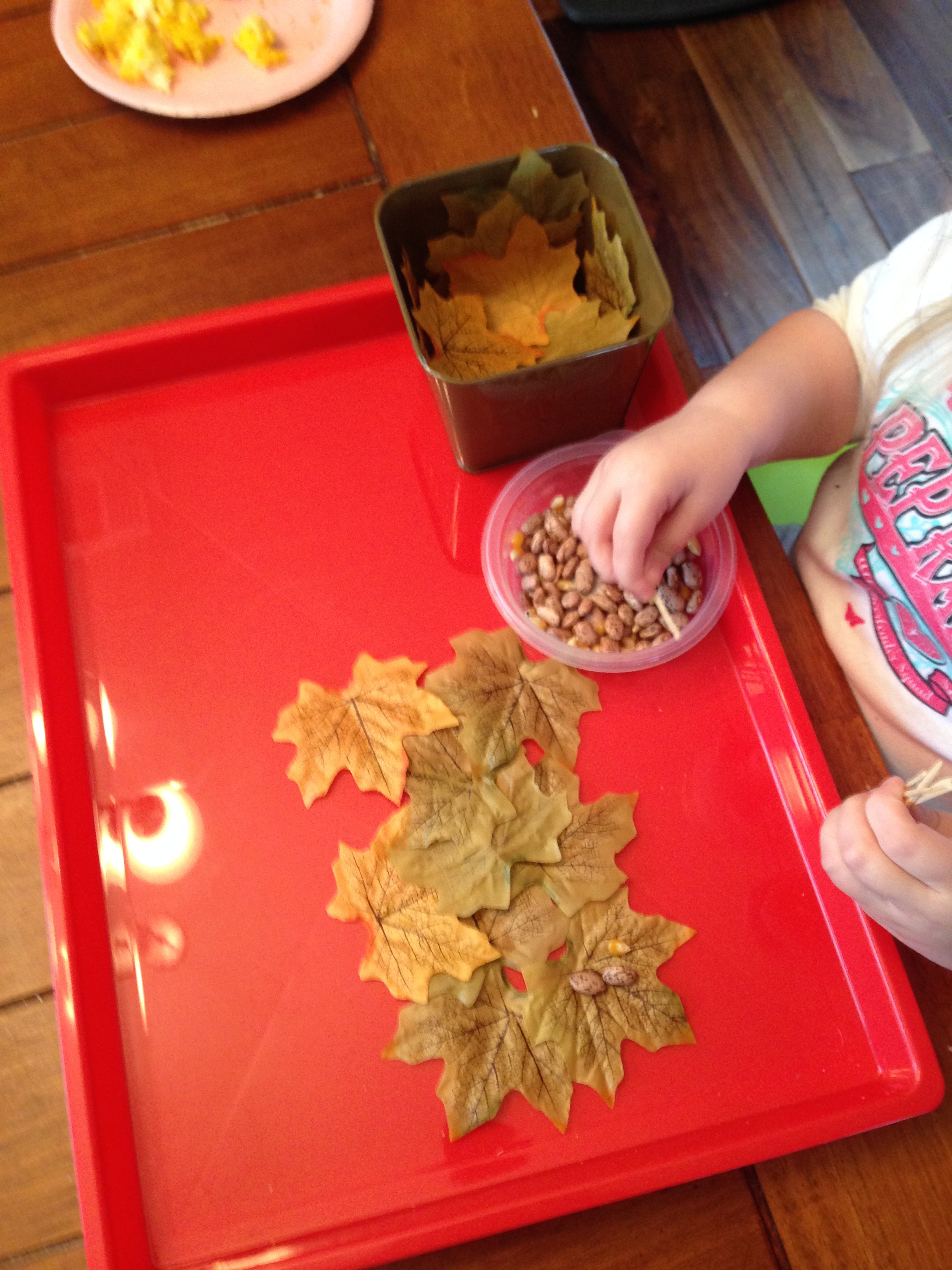 Fall Tree Activity – See my blog post yesterday for this fabulous activity – where your child matches numbers to encourage recognition out of order. And just a side note – you realize you could do any numbers you wanted – it could be 50-70 or 80-100 (although you’d have to write really tiny to fit three digits on the center of one of those lids, you could easily write the number on the side – and go as big as you want!) OR – what about this extension for your older kids? Write an addition, subtraction, multiplication, or division problem on the side of the lid, and they have to match it to the answer on the tree! Again, color coding helps make it a little easier, so if you have two or even three colors of lids that are fall leaf colors, that would be awesome. Or, make it more challenging by making all your leaves/pouch tops the same color!