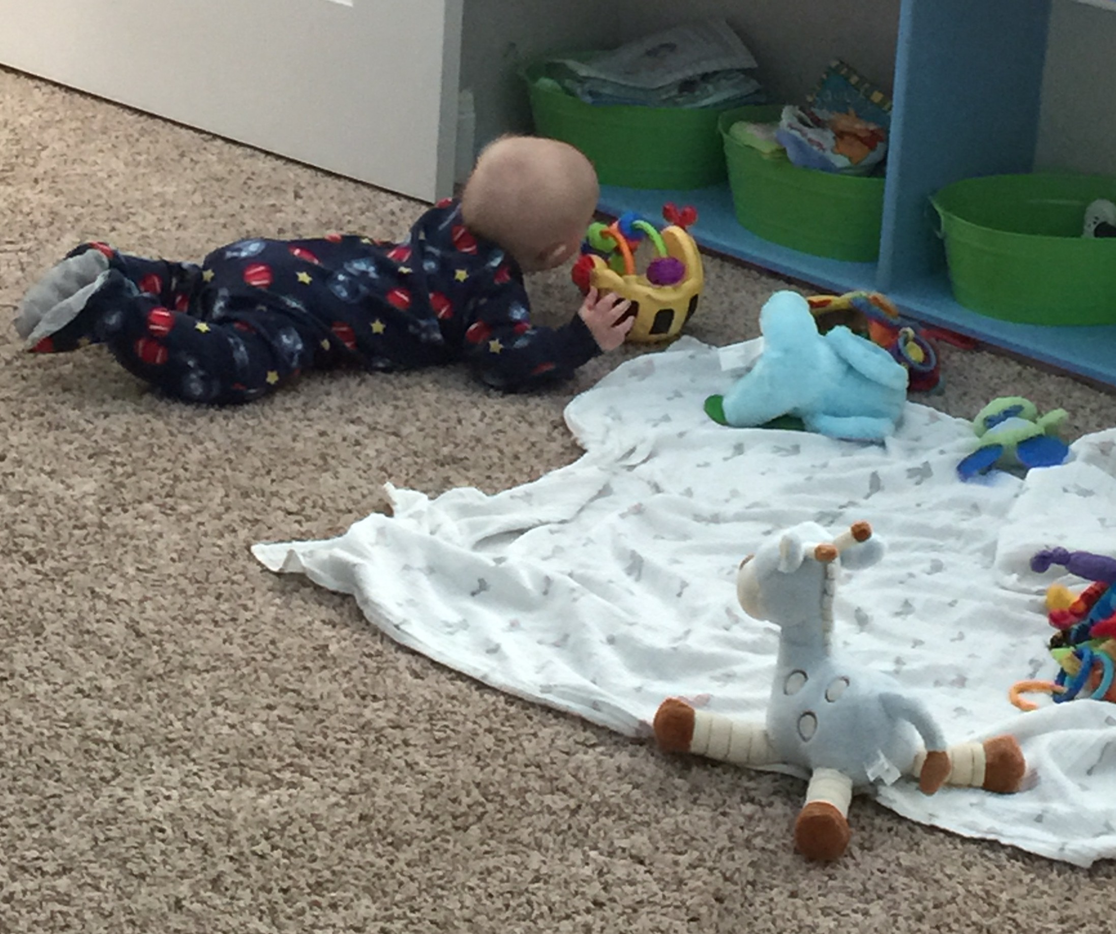 Many babies don’t start out liking “tummy time.” They may scream and cry as they struggle to pull up their head, and then as they learn to roll over. But struggle is part of learning. Remember that the butterfly doesn’t just POP out of the cocoon. It has to struggle. The tulip doesn’t just burst open instantly – but slowly unfolds. And it’s hard as a mom – I’ve watched two babies pass that phase, and it’s NOT easy to sit there next to your child while he or she cries and struggles. In that stage, I would typically sit and watch the clock, and offer lots of encouragement. I’d only let the struggle go on for a very short time – two or three agonizingly long minutes. But it’s paying off!! Grayson is rolling both directions, and learning how to wiggle his way in a sort of “Army crawl” to anywhere he wants to go.