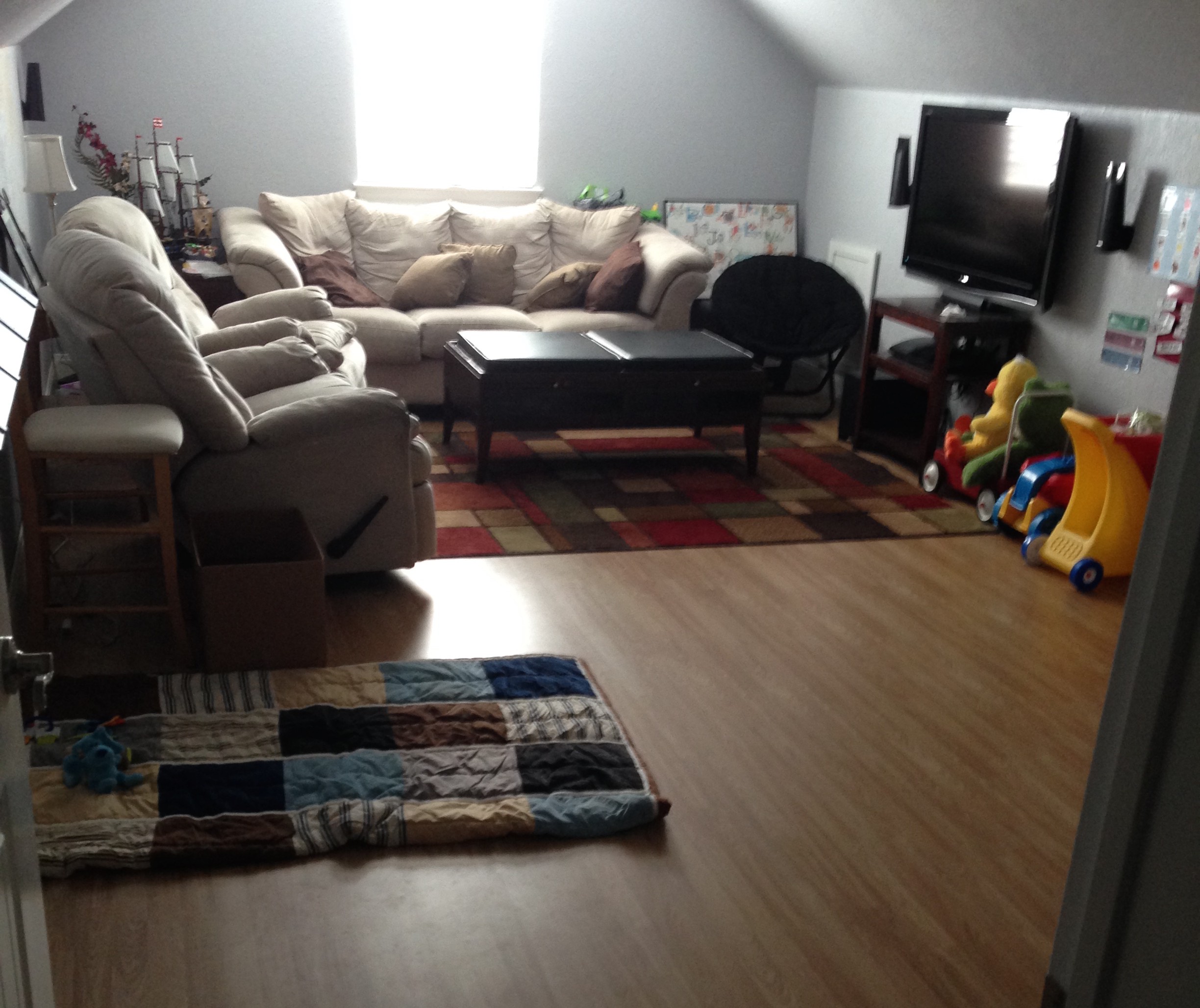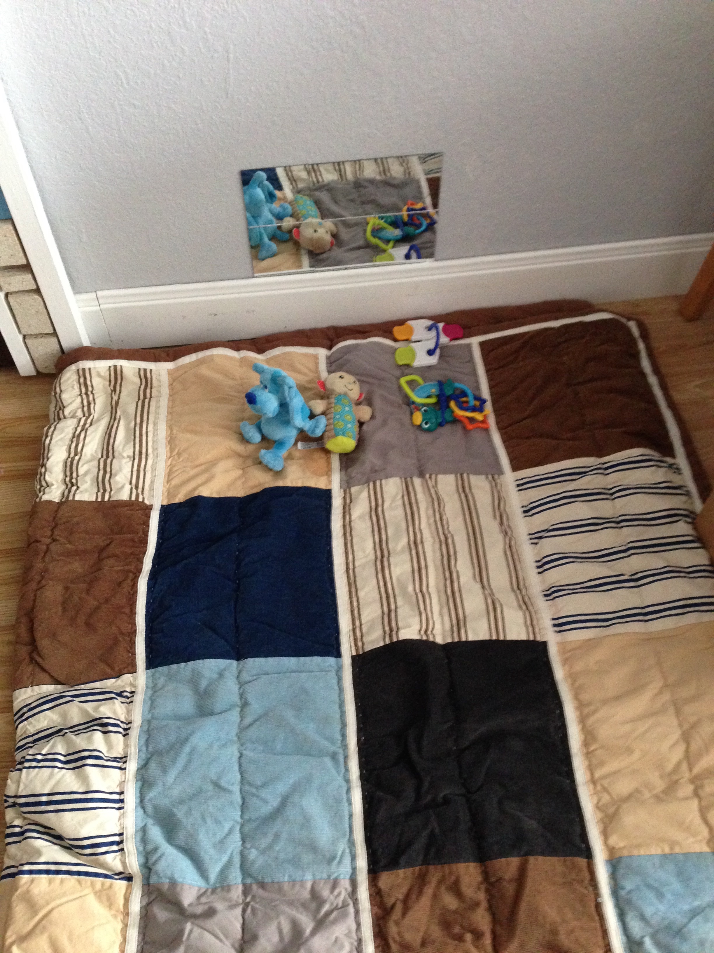 I wanted to create a special place for him in our family room – because we have our “adult” area with the couch and recliners, and then Becca’s playthings are everywhere, so I got a comforter out of the closet that has several really need textures on it, folded it in half, and created a little space just for him. He has some toys, but the highlight of his play area is the little set of mirrors I attached to the wall. He loves looking at himself in the mirror! I got these 4″ Square Glass Mirrors (I purchased 6 – aff link) and just hot glued them on. There are lots of options for sizes and shapes: Darice Mirror Options