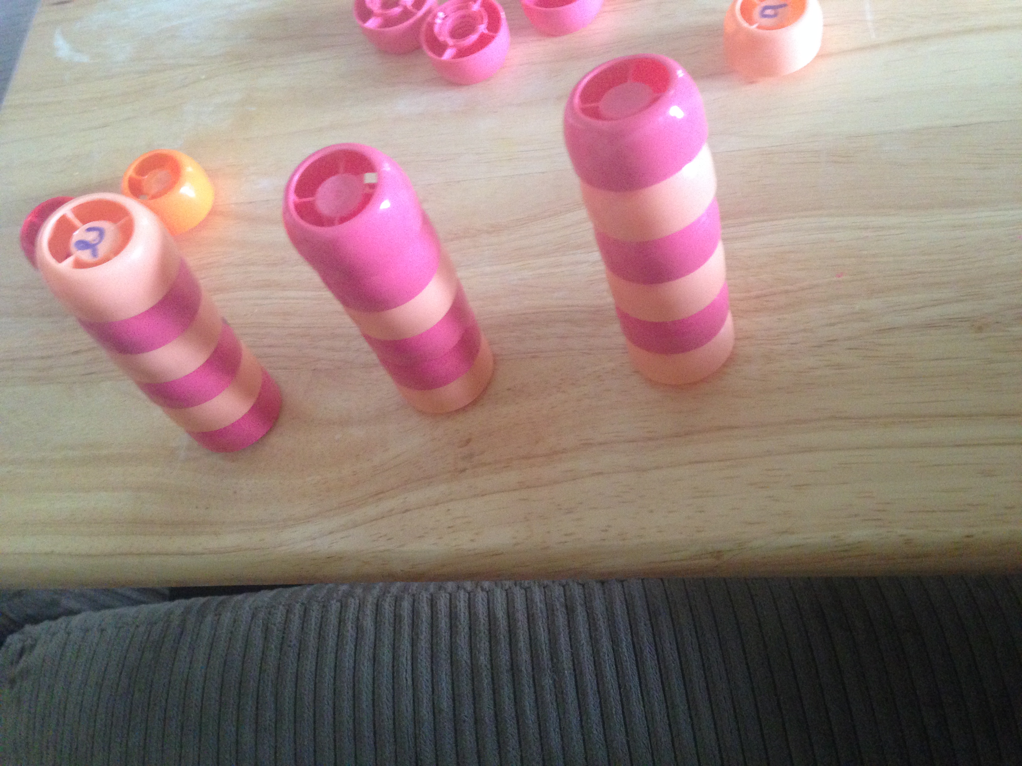 Imaginative Play Activity – Build your family!  Did you ever think that you could make people with these little pouch tops?  And houses?  Becca loves to build with her pouch tops, so one fun activity was to make our family.  I drew faces on four lids, and then we stacked them up by height to create our family!  Now, you could take it a step further and hot glue them together so they could walk around and go into their house, etc.  But Becca enjoys building the people over and over.  She searches through and finds the faces, and then builds them over and over again.  She knows Mommy and Daddy are four pouch tops, she’s three, and Baby Grayson is two.  So it makes a great counting activity, but stacking them is also great for her fine motor development – because by the time she has three stacked up, she has to be very careful to not knock them over!  She loves building castles and houses for her people, as well!  Super fun.