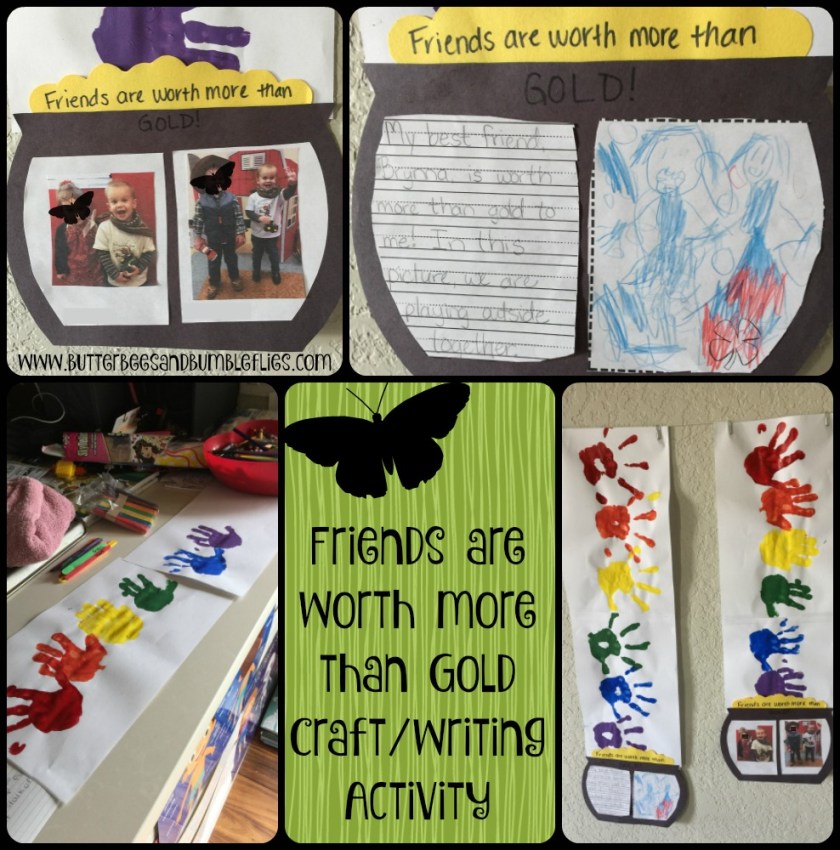 The thing I love about her free printable activity is that it’s very flexible for kids of all ages and stages. To make my pots, I simply cut black construction paper out around Lindsey’s pot template and then cut out the coins from her template from yellow construction paper. Becca decided she would draw her picture first, and then tell me what to write about it. She is the one who picked that it would be a friend theme – the actual writing template says “Who is worth more to you than gold?” She decided that Gray’s should have his friends, too, so I used the blank pieces from the set and just printed out pictures of him with his friends since he wasn’t interested in drawing them on the paper. I just asked him who he wanted me to include and he told me.