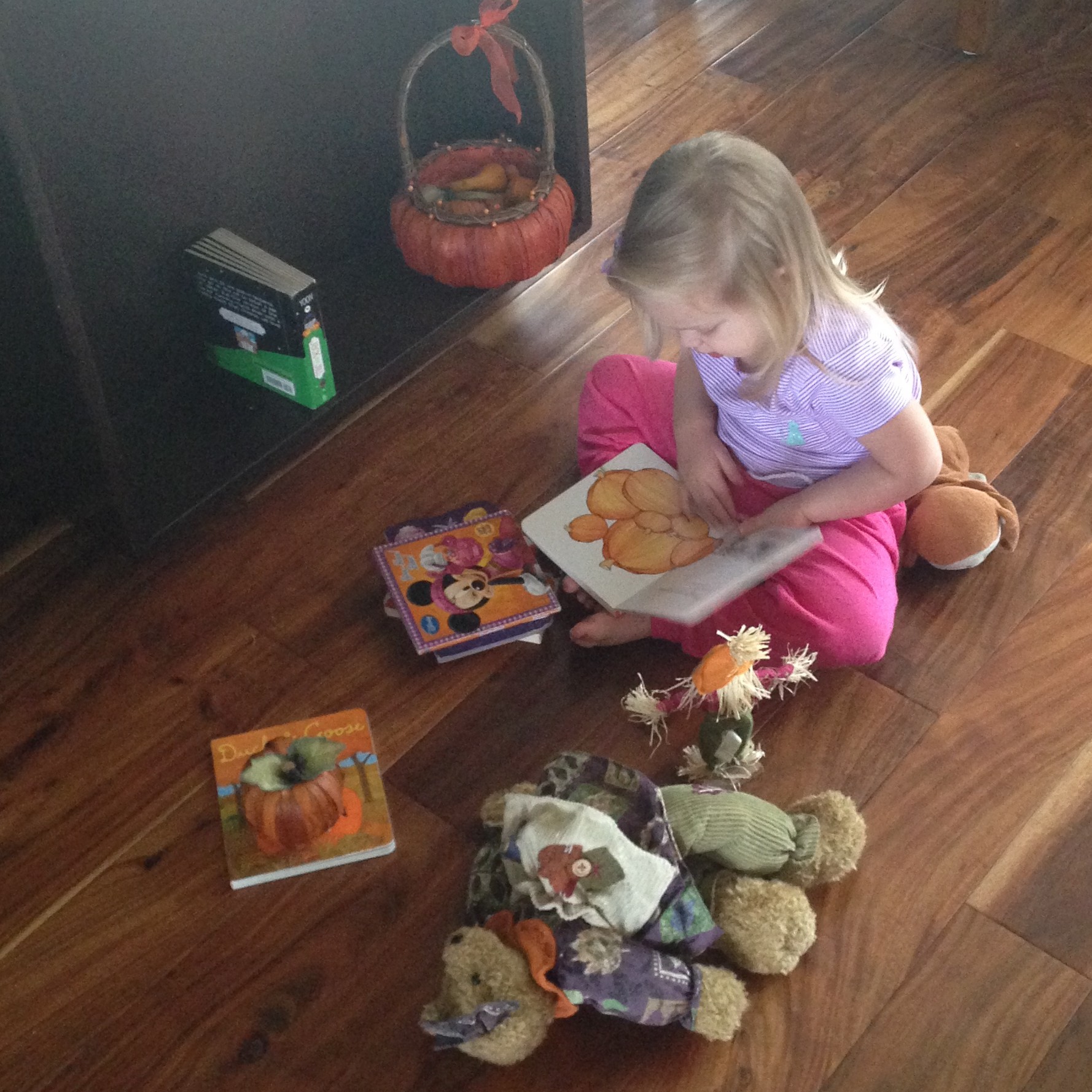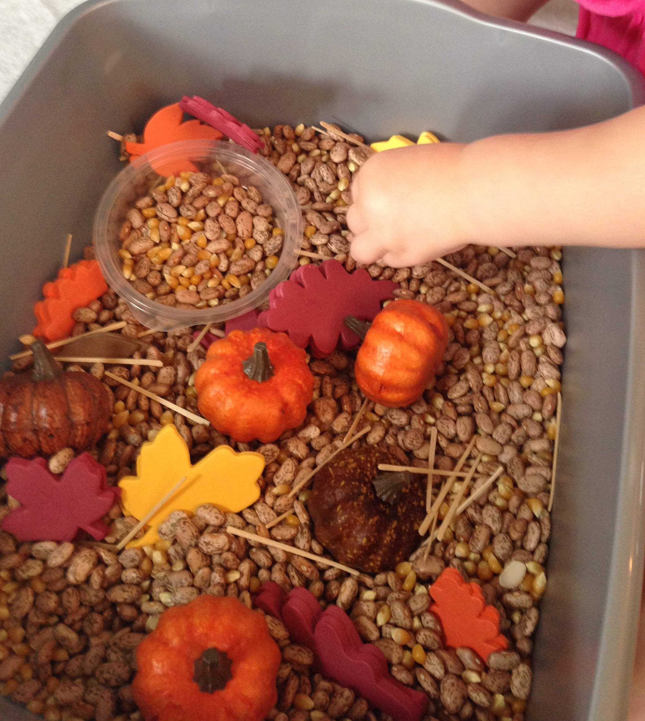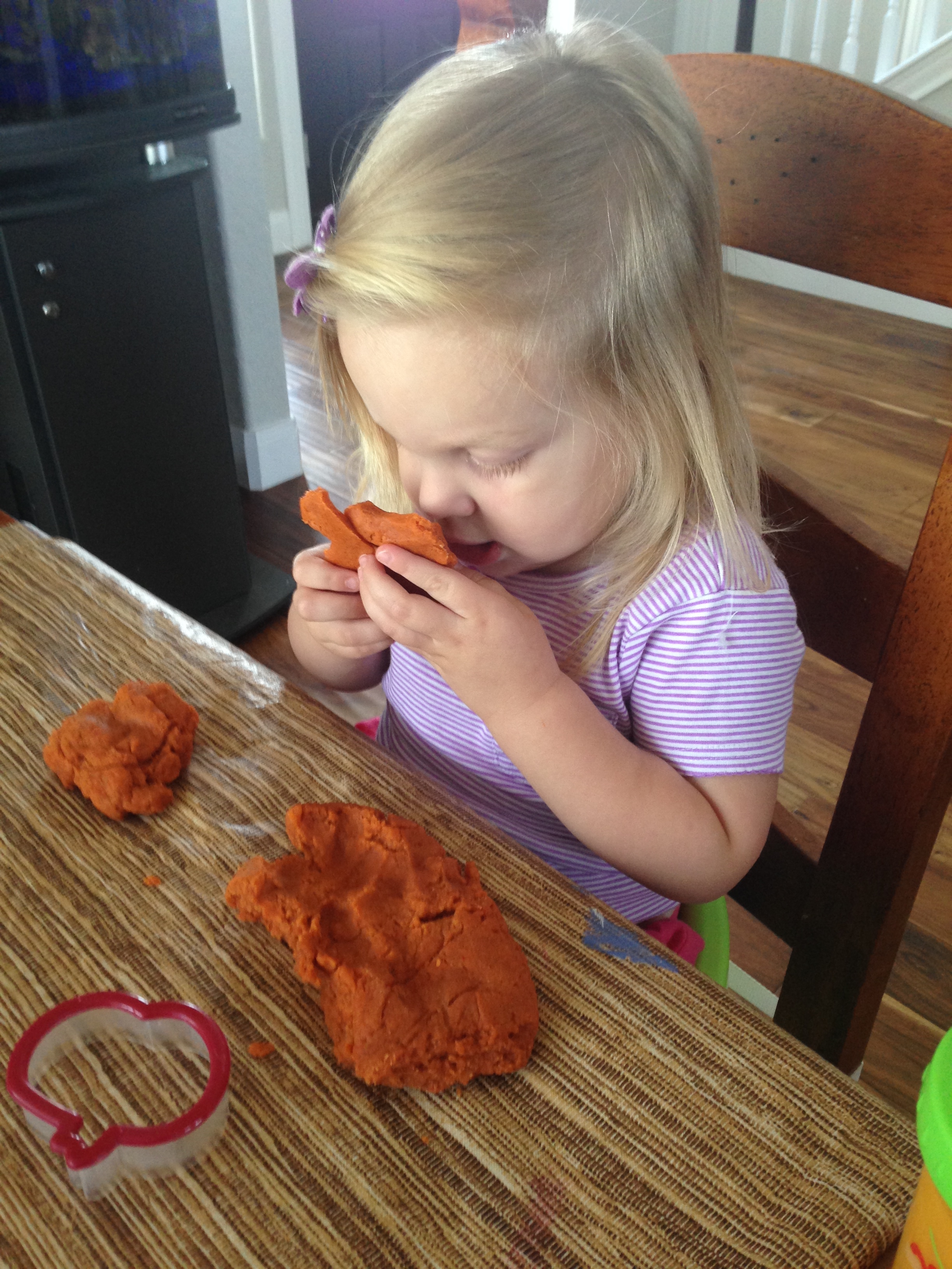 Here she is smelling it – she did this several times – it really does smell GOOD, ya’ll. (A great conversation about our 5 senses followed – and she informed me that we can hear it too – we can hold it to our ears and squeeze it!) I gave her some fall shaped cookie cutters to play with, and she loved them! She kept calling the turkey a chicken, but we can work on bird recognition later. 🙂