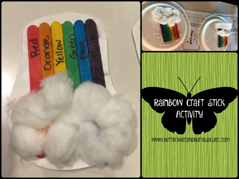 I simply had my kids squeeze glue (working on those fine motor skills!) onto the back of a thick paper plate (to provide a nice solid backing). Then, lay the labeled craft sticks in order of the rainbow. (I purchased colored craft sticks at Walmart, but you could also have them color or paint plain sticks.) Then stretch your cotton balls and glue on top. Once it is totally dry, you can cut off the excess plate and display your beautiful rainbow!