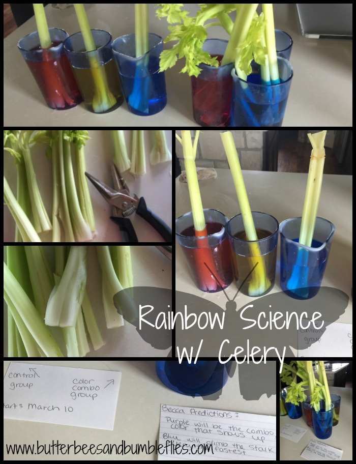 By just a few hours in, the blue color in the control group was already showing, and hints of blue were showing in the experimental group as well. She was so excited that her first prediction was correct! We’ll leave the celery stalks out for one week and discover if the colors will blend in the stalks, or if they will stay as separate colors.