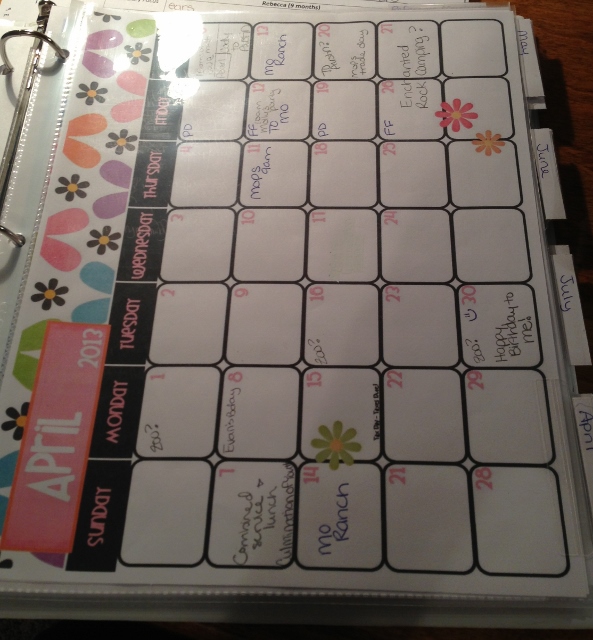 Recently, however, I got tired of my Office Depot-purchased calendar book, with its tattered pages and multiple paper clips trying to hold everything together. I wanted something cute and fun, that fit my needs. So, the search began. I didn’t want to spend any money, so I looked on Pinterest for ideas… and found LOTS of calendar and organizing ideas. I decided that I’d use a binder I already had, paper I already had, plastic sleeves I already had, and tab dividers I already had to make the perfect binder for me! And that’s what I did. Here are a few shots: