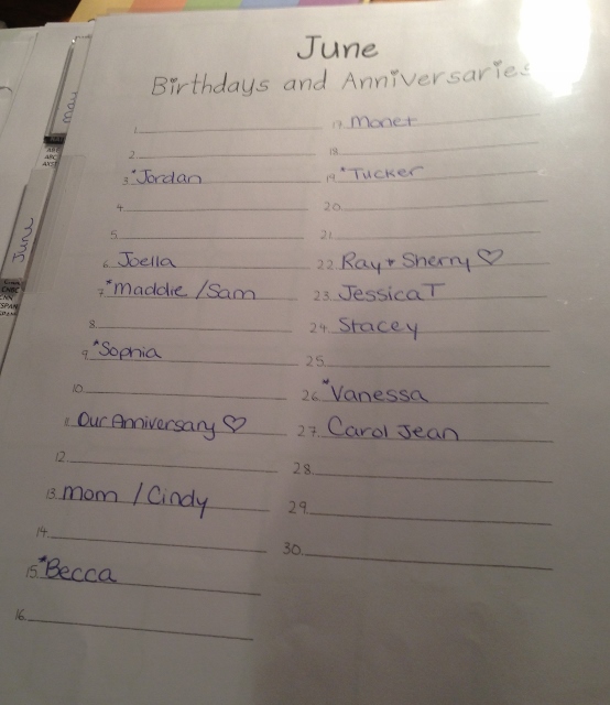 On the back of each monthly calendar, I have a calendar for recording birthdays and anniversaries! Perfect because it’s not year-specific and can be kept in the binder even when the years go by. Perfect for quick reference, and easy to add to when new friends come along!