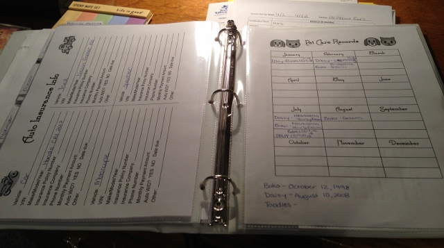 In the back of the binder, I have a reference section, where I can keep my (ideal) household cleaning schedule, home and auto maintenance schedules as well as auto insurance information, pet care records, and since they are in plastic sleeves, the back is the perfect place to store pet shot records and receipts. Becca has her own binder, which I’ll share at some point in the future. If you would like to download these pages that I personally created, you can download them here: